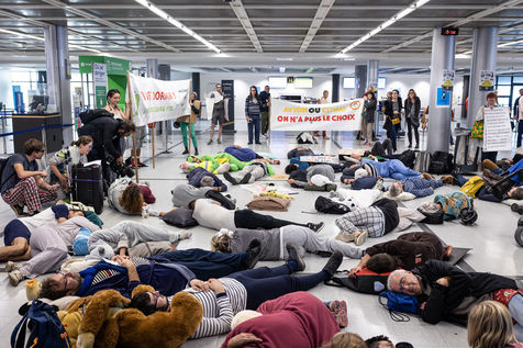 Action of civil disobedience at the Nantes Atlantique airport organized by the GIGNV to protest against the noise, environmental and climatic nuisances linked to air traffic and the non-respect of the curfew, normally in force at the Nantes airport. The GIGNV (Groupe d'Intervention des Grenouilles Non Violentes) is a citizen collective from Loire-Atlantique which fights for social and climatic justice by organizing non-violent actions of civil disobedience.