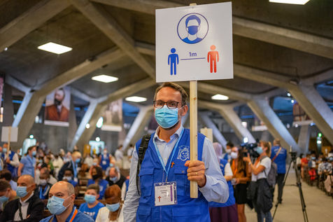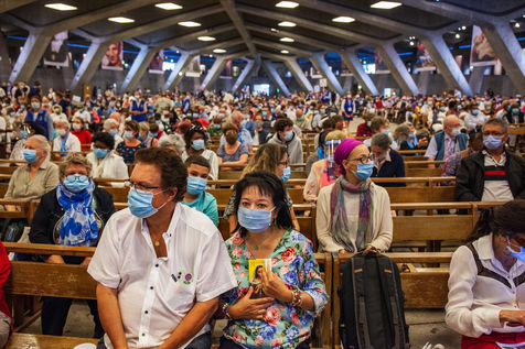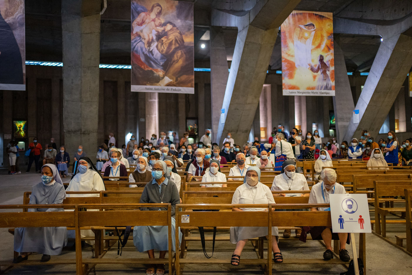 Messe de l'Assomption dans la Basilique Saint-Pie X du sanctuaire de Lourdes présidée par le cardinal Pietro Parolin, secrétaire d'Etat du Saint-Siège. Lourdes, 15 août 2020.