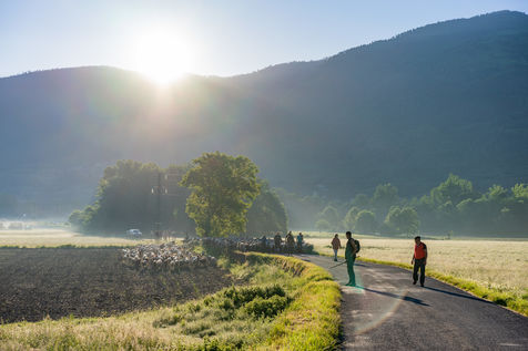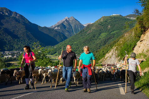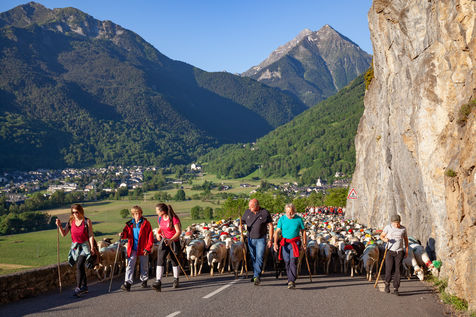 Transhumance de Soulan, montée en estive de 700 brebis vers leur paturage d'été au dessus du village de Soulan dans les Hautes-Pyrenees.