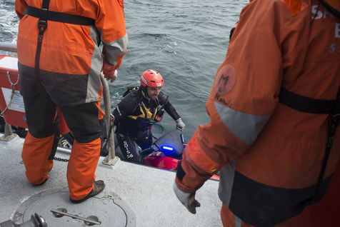 SNSM de Quiberon. Les sauveteurs en mer de la Presqu'ïle de Quiberon en manoeuvre. Sur leur vedette, ils se rendent au large pour un exercice de sauvetage.