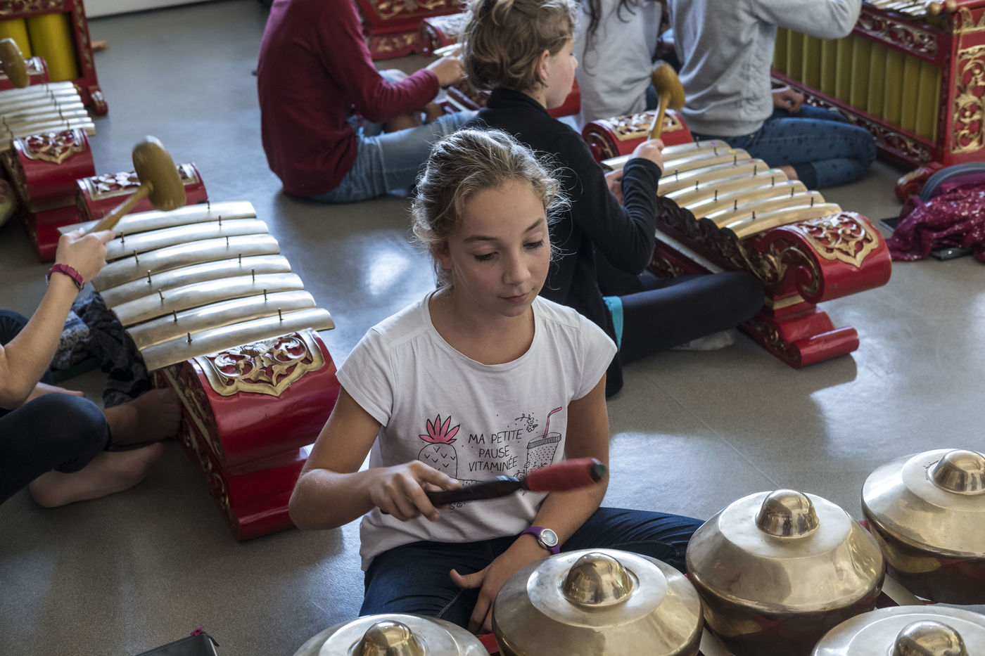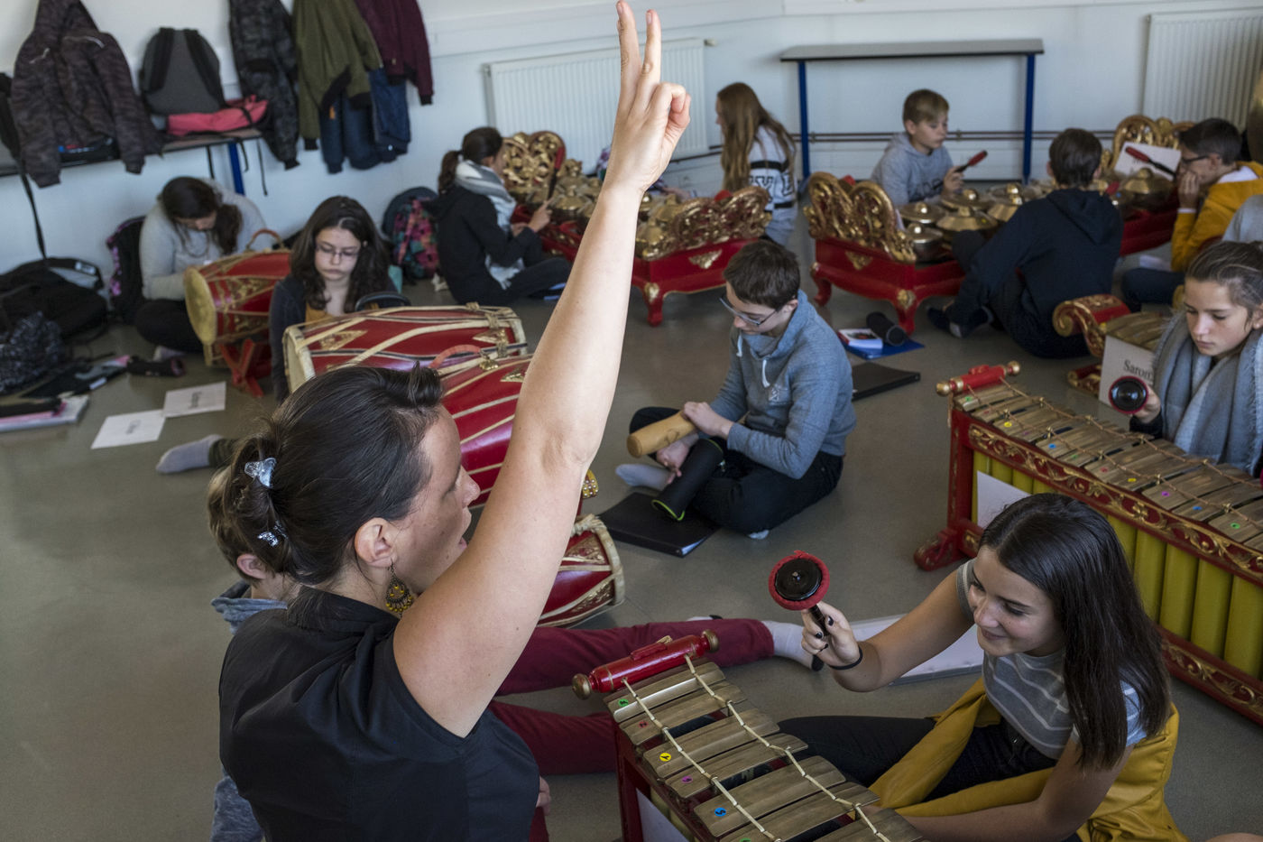 Une professeure de musique a enseigné le Gamelan, un instrument indonésien aux élèves de son collège.