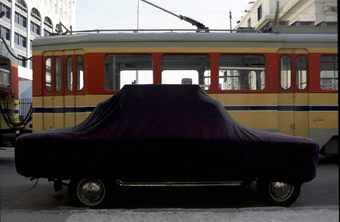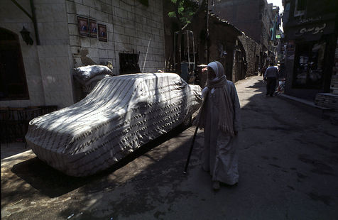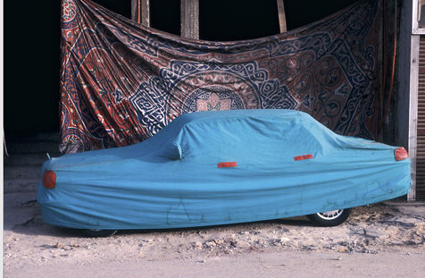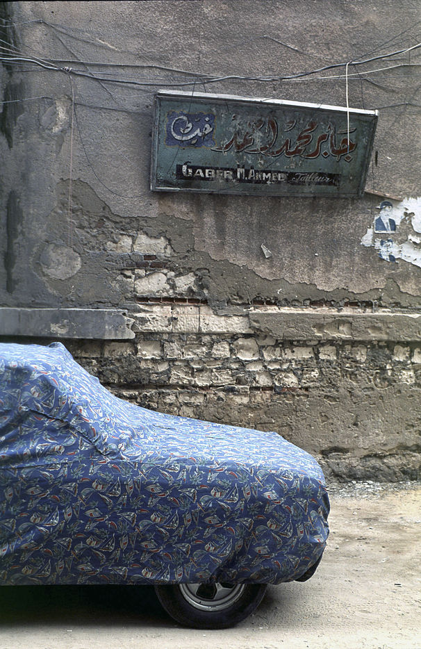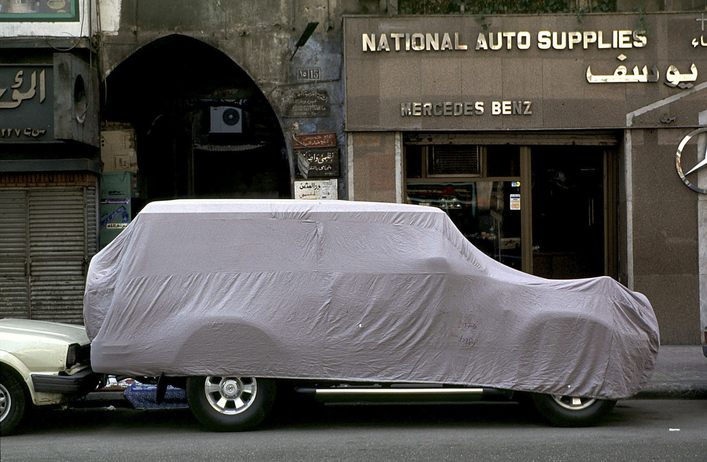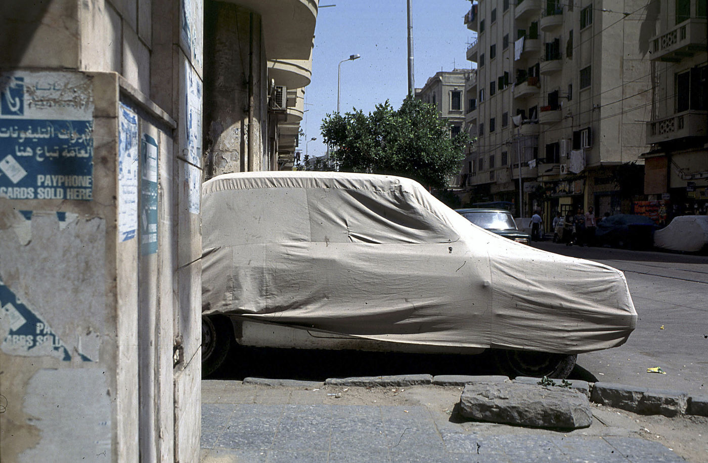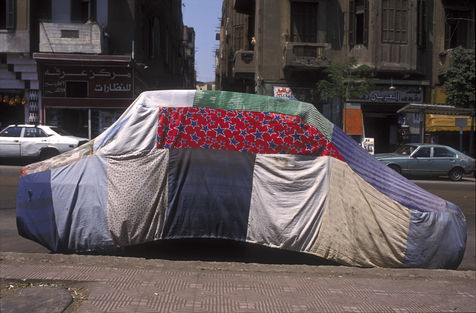During a trip to Egypt, I noticed these tarpaulins covering parked cars. Finding the phenomenon too recurrent not to be funny, I photographed some of them. These tarpaulin-covered cars, once enclosed in the rectangle of the photo, took on a dimension that I hadn't sensed when I first saw them. They had taken on a meaning of their own, in a purer frame. They became characters draped in colour, life, humour, history and stories. With its veil, the car leaves its role, it is no longer "the object of mass consumption", nor the simple illustration of "modern life". It is no longer the object of mass consumption, nor is it a mere illustration of "modern life". It is no longer the object of masculinity, nor does it carry the heavy duties of power or wealth that its owner usually imposes on it. Here, hidden under her personalized canvas, she becomes playful, seductive, feminine, and suddenly allowed to witness the passage of time. The covered cars belong to the turbulent streets of cities, their impromptu markets, the unusual scenes that take place there, their dilapidated theatre sets. The car is a dressed actress, whose dress and scene accompany her identity. A harmony is established, born from the alliance of the model and its canvas with the small details of the frenetic life of the street. So I photograph the covered car that has a meaning in her city. I avoid isolating it from its frame. I want to play with the background, the environment, chance. Without wanting to, and without knowing it, the owners of these covered vehicles practice a form of urban art, an art brut and spontaneous. I want to be a simple witness of their work, to show a simple and laughing Egypt, the colourful and artistic life of the street through these unusual cars whose make and bodywork are unknown.