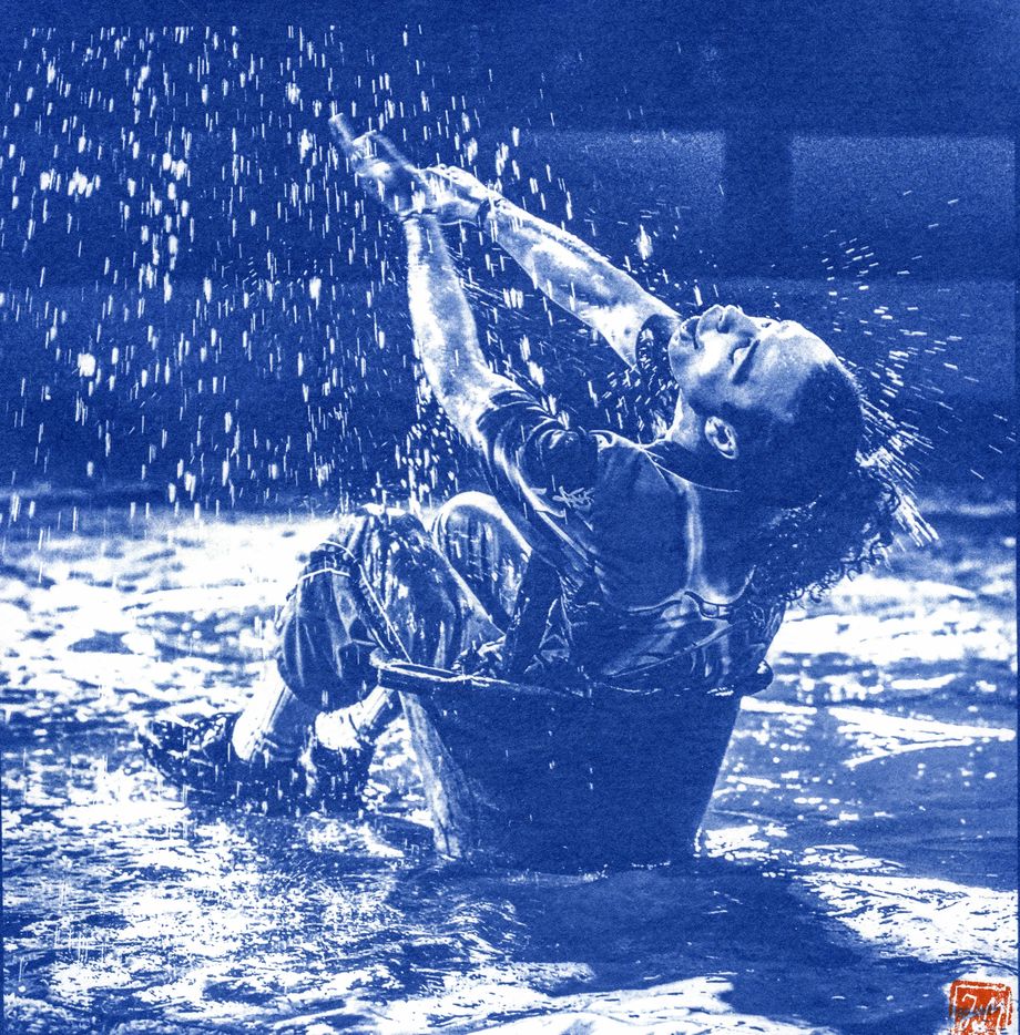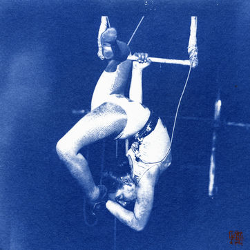 The circus has come to town. I went to meet the circus. For a week, they welcomed me in the middle of the caravans, during rehearsals and I attended many performances. I rewrote these images using an old monochrome negative photographic process, the cyanotype. Thanks to UV light (from the sun or from a lamp), we obtain a Prussian blue, cyan blue photographic print. This technique was developed in 1842 by the English scientist and astronomer John Frederick William Herschel.