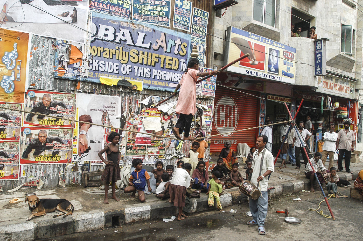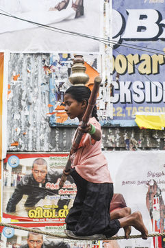 Streets of Chennai, India, a young girl performs acrobatics to earn some money.