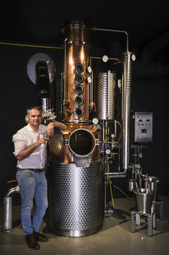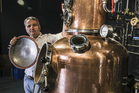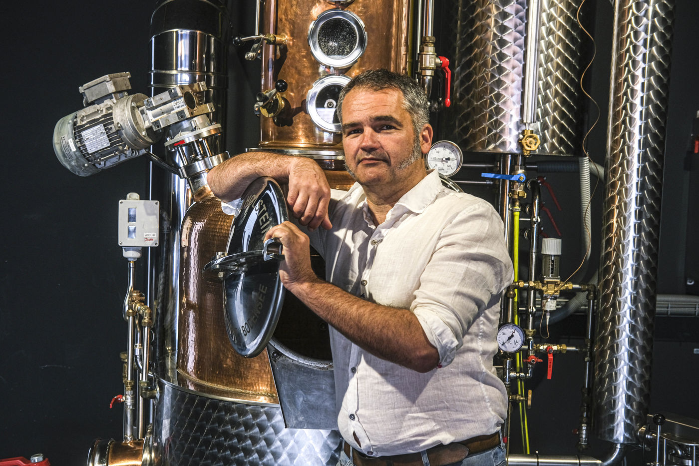 FRANCE, LE MANS. 26/04/2022. The Sonneur distillery, in Le Mans, is a tree farm and a distillery. Its creator, EMMANUEL VITON, made a name for himself by creating a rillettes brandy.