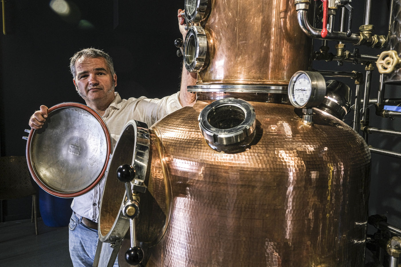 FRANCE, LE MANS. 26/04/2022. La distillerie du Sonneur, au Mans, est une ferme arboricole et une distillerie. Son créateur, EMMANUEL VITON, s est fait connaitre en créant une eau de vie de rillettes.