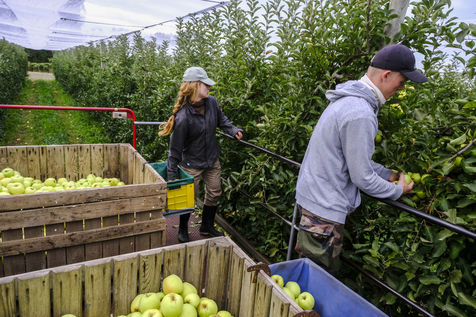 The apple harvest. In the orchards, the harvest is coming to an end. This year it started early. The pickers fill the paloxes which are then towed to the warehouse. The fruit is then washed, dried and graded (automatic grading machines). The bagging is done by hand.