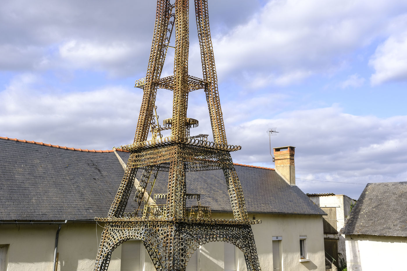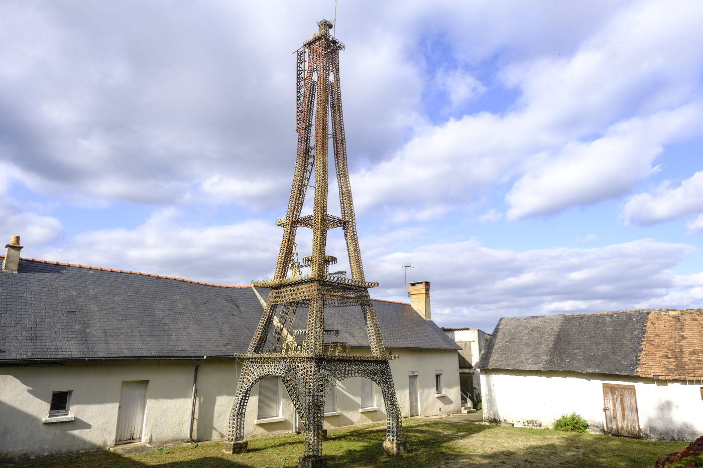 For sale, a replica of the Eiffel Tower. In Fougere, a municipality of Bauge in Anjou, in the east of Maine-et-Loire, an amazing building could soon disappear from the landscape. This Eiffel Tower is more than 16 metres high, made entirely of horseshoes welded together one by one. There would be no less than 7,500 of them, all gleaned from the Saumur cavalry.) With the help of his children, its builder, Henri Travert, took four years to erect it in his yard. It is for sale at 10,000 euros.