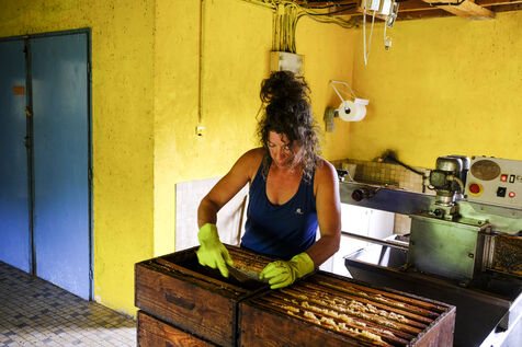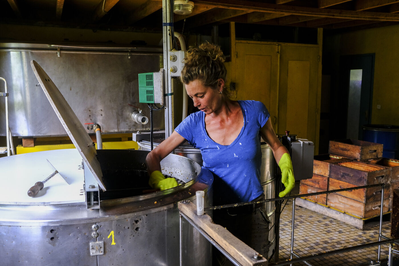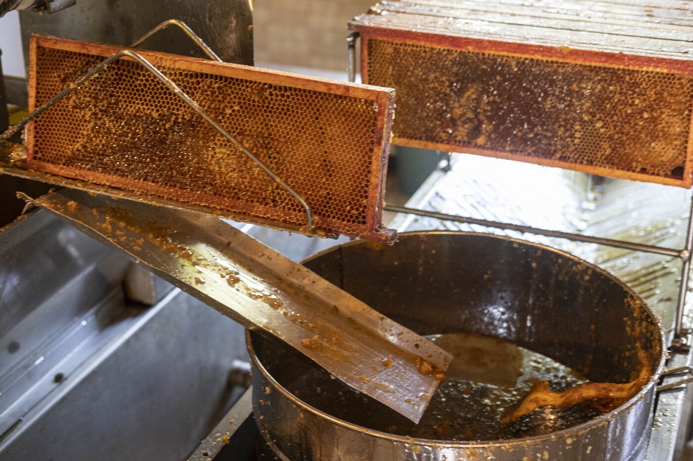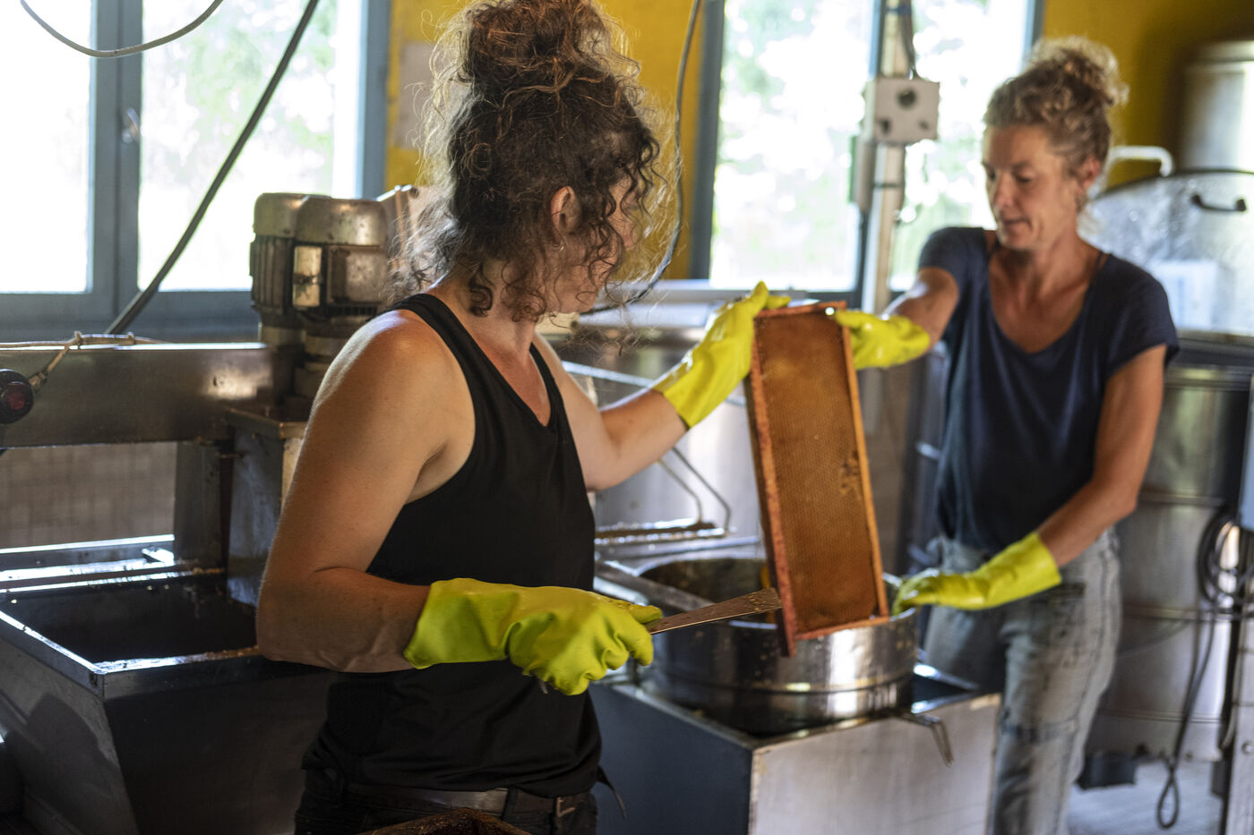 FRANCE. BAUGE EN ANJOU. 08/07/2023. Beekeepers harvesting the first honey from their hives. Then it has to be extracted from the crates. This is done by hand. The honey is then extracted by machine. The honey is stored in vats. Then, after a few weeks, it is put into jars.