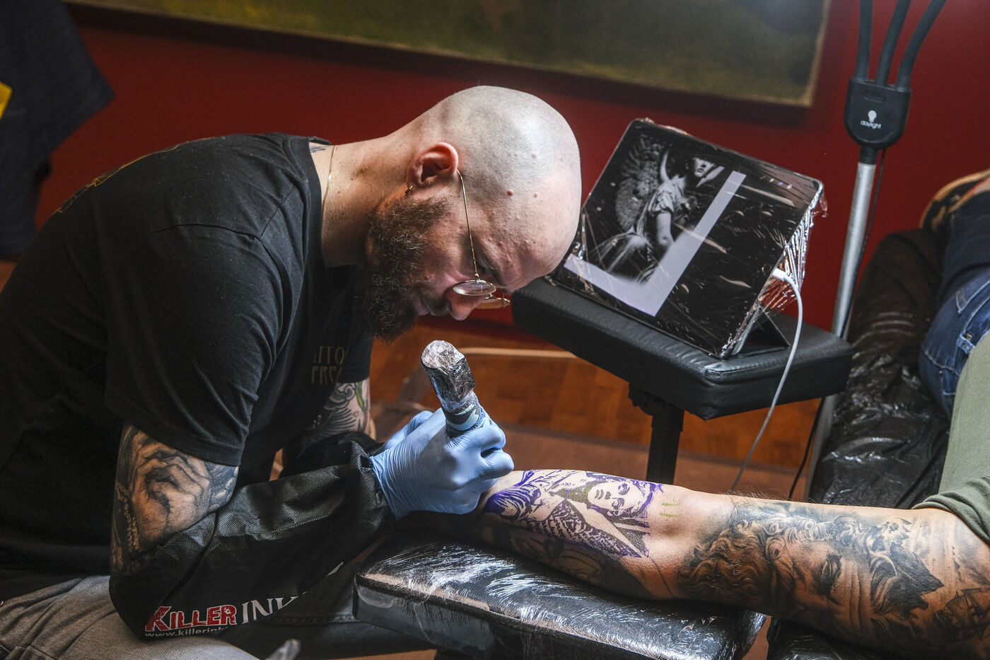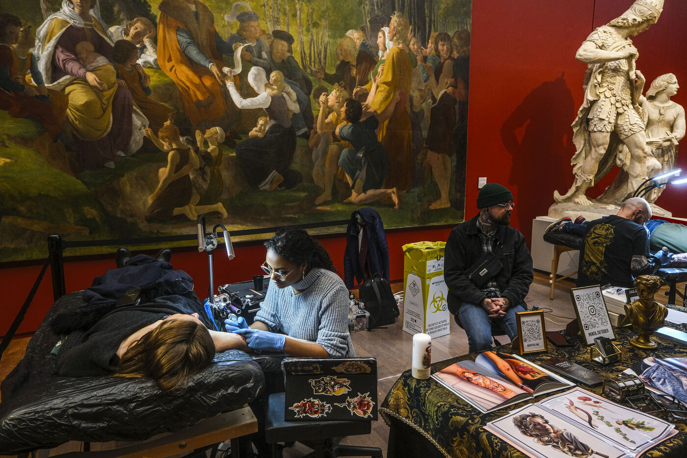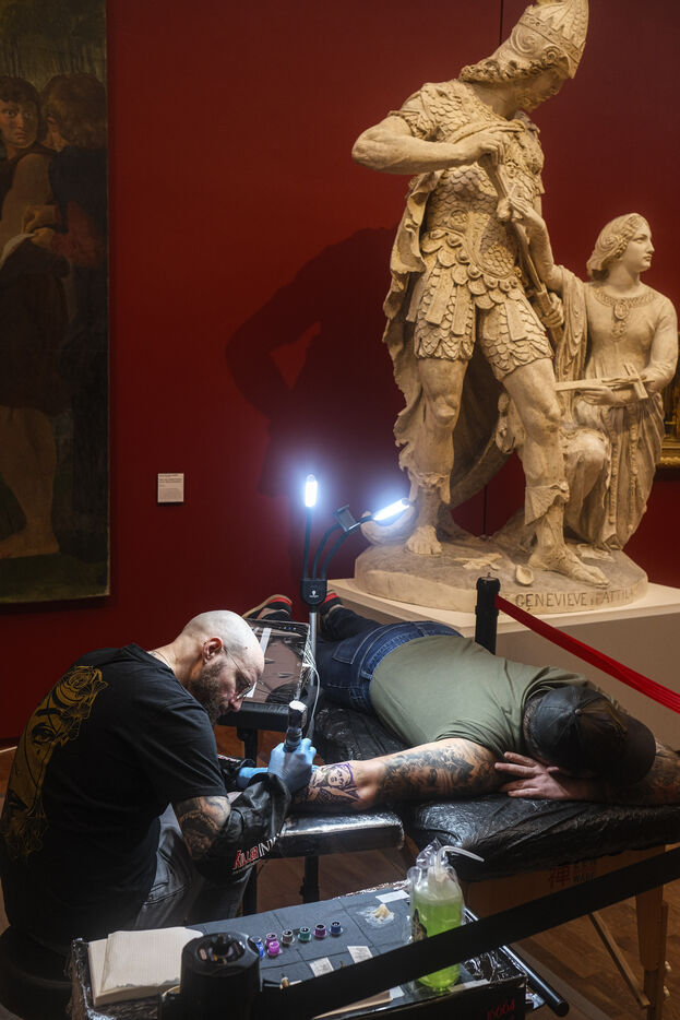 FRANCE, ANGERS. 20 January 2024. For one day, eight tattoo studios took over the Musee des Beaux-Arts in Angers. They operated among the works of art and visitors. The event offered a variety of tattooing styles, from flash tattoos to personalised appointments, artistic performances and ephemeral tattoos. L'art dans la peau is a way of looking at tattooing as an art form in its own right.Photographs by Jean-Michel Delage/Hans Lucas