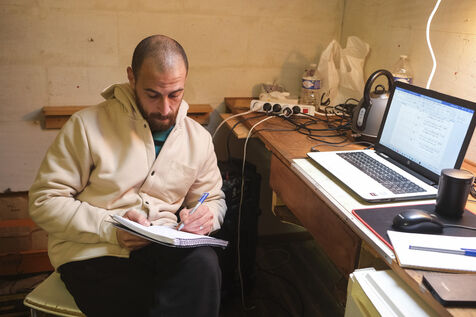 FRANCE, ANGERS. 11 mai 2025. Après avoir fui Gaza, cinq musiciens palestiniens et leurs familles sont accueillis, depuis le 9 janvier, par l'association Al Kamandjati, à Angers. Ces réfugiés bénéficieront d'une résidence d'artiste pendant un an grâce au programme PAUSE, un programme national d'accueil en urgence de scientifiques et d'artistes qui ne peuvent plus mener leurs travaux librement dans leurs pays d’origine, lancé en 2017 par Collège de France.