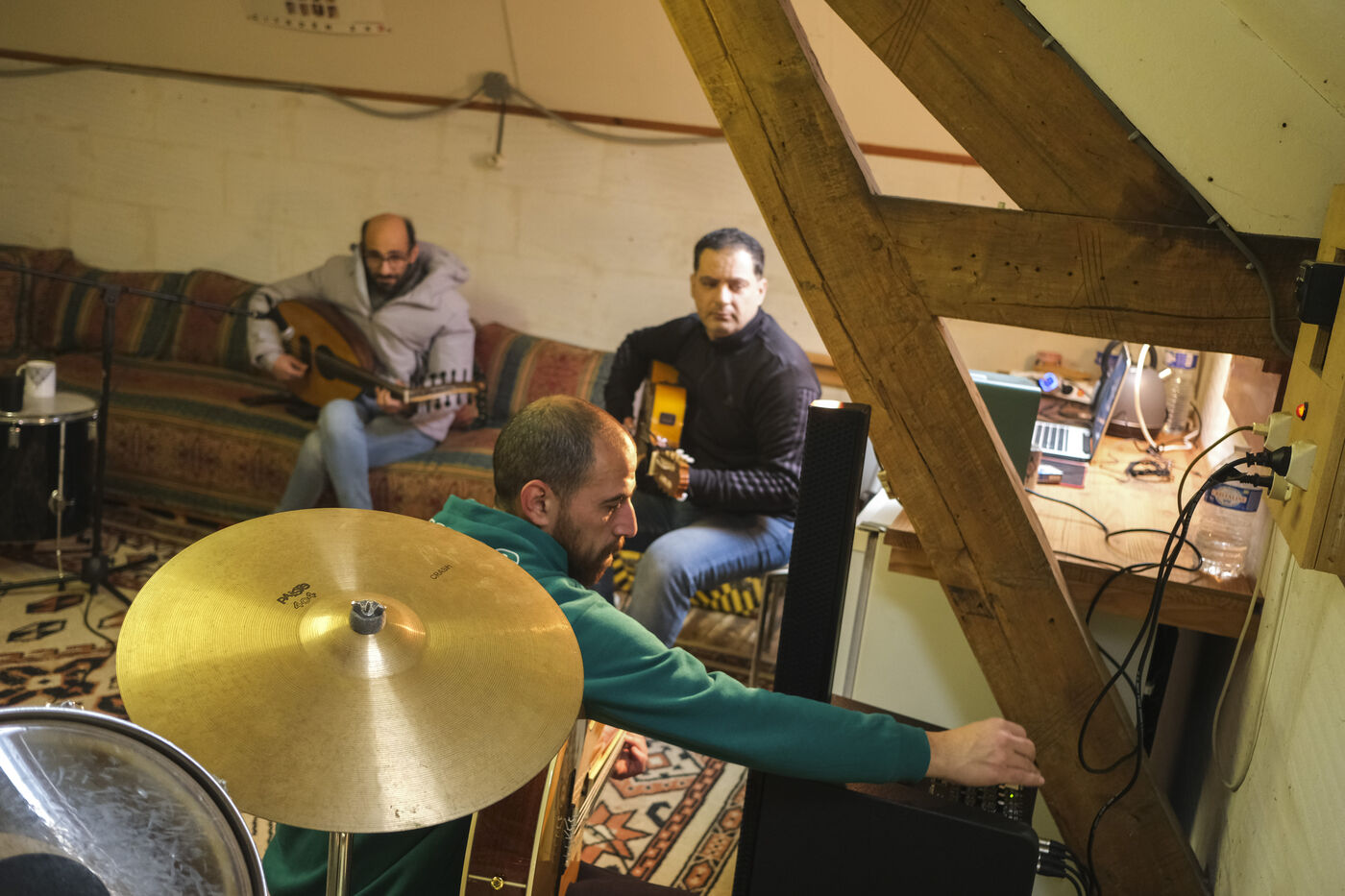 FRANCE, ANGERS. 11th may 2025. After fleeing Gaza, five Palestinian musicians and their families have been welcomed by the Al Kamandjati association in Angers since 9 January. These refugees will benefit from an artist's residency for a year thanks to the PAUSE programme, a national emergency reception programme for scientists and artists who can no longer carry out their work freely in their countries of origin, launched in 2017 by Collège de France.