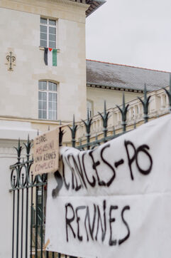 Les étudiant·es de Sciences Po Rennes ont bloqué leur école mardi 30 avril 2024 en soutien au peuple palestinien et aux autres étudiant·es mobilisé·es et arrêté·es à Paris ou dans les universités états-uniennes.