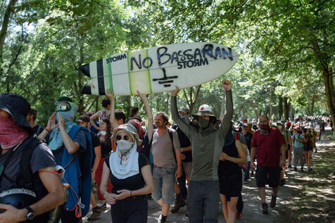 A demonstration against mega-basins and agro-industry was organised by Soulèvements de la terre and the Bassine non merci collective in La Rochelle on 20 July 2024. According to the organisers, around 10,000 people turned out despite the prefectural ban. The rally lasted almost seven hours, with speeches, the march (whose trajectory deviated several times in the face of police barricades and charges), reunions between the different processions, and above all the festive moments, such as the final swim on Concurrence beach.