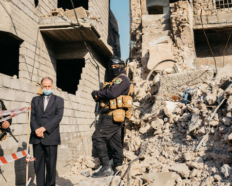 7 mars 2021: Au coeur du vieux Mossoul, particulierement meurtri par la guerre contre l etat Islamique, le pape Francois a tenu place des eglises (toutes detruites par Daesh) un discours de paix et de fraternite devant une assemblee de Mossouliotes chretiens ou musulmans sunnites et un important dispositif de securite.