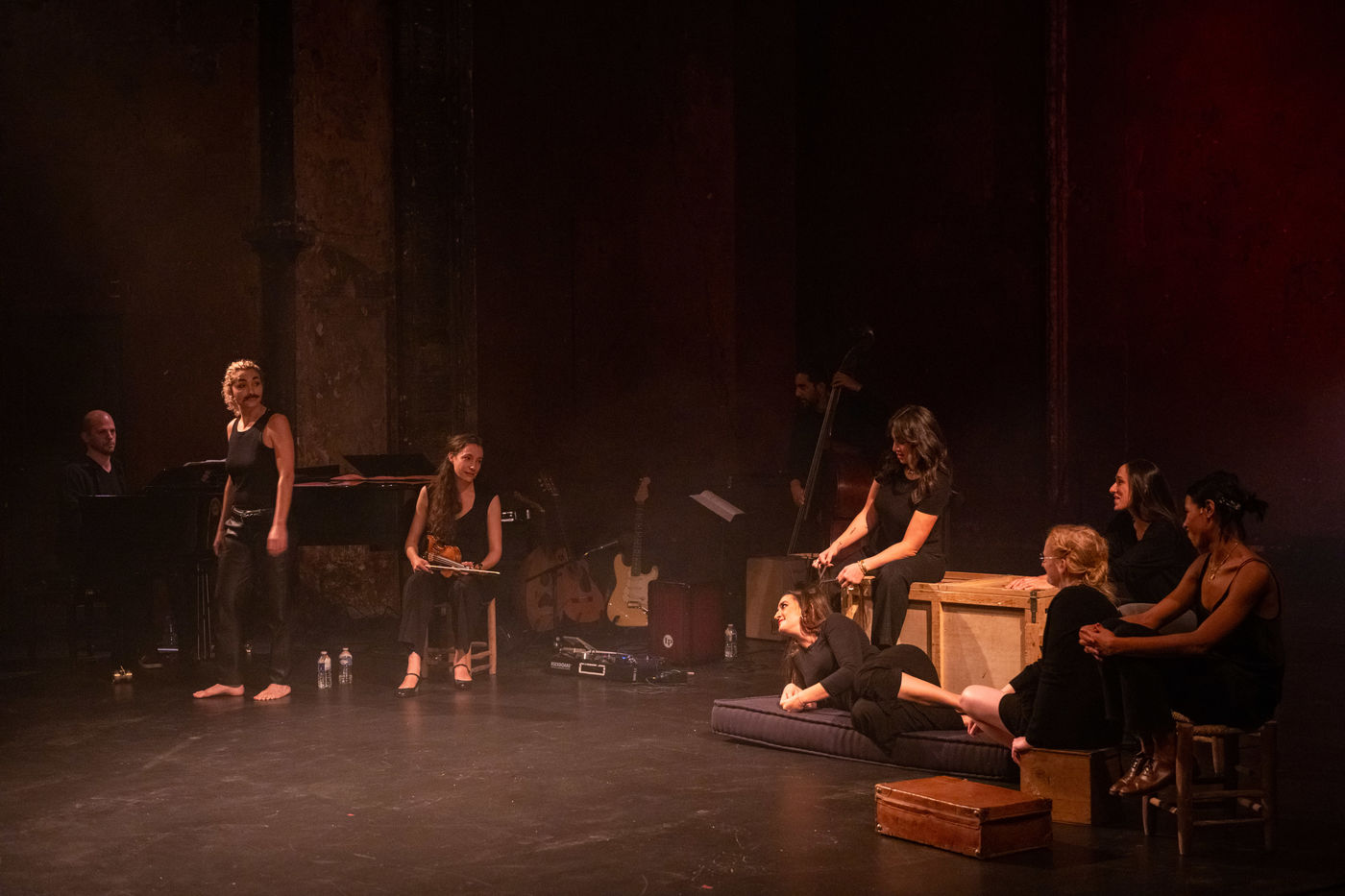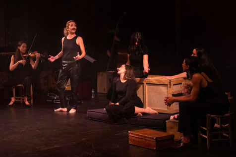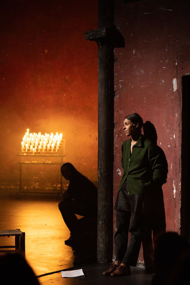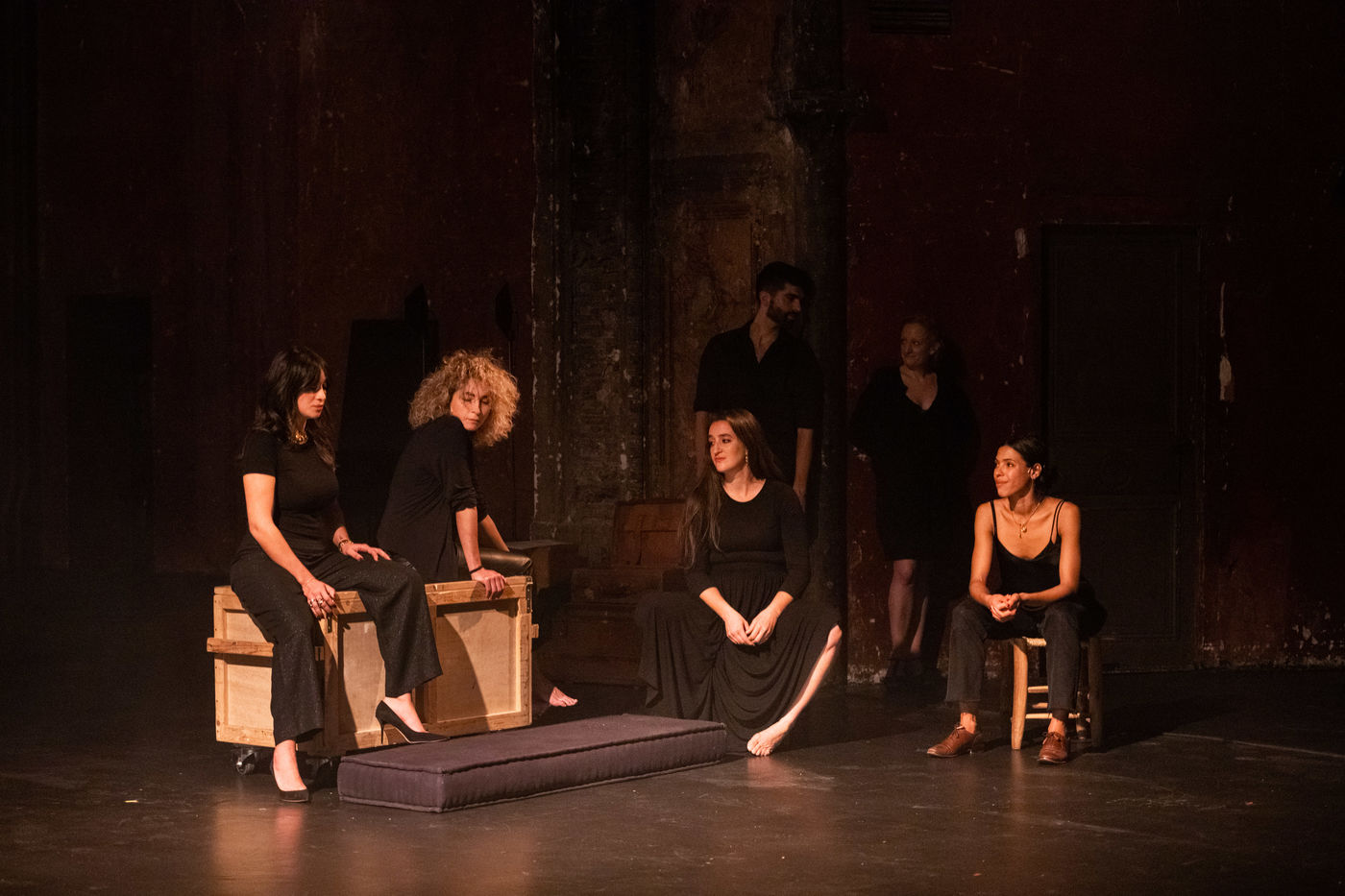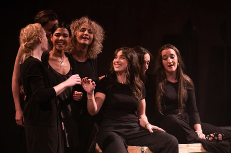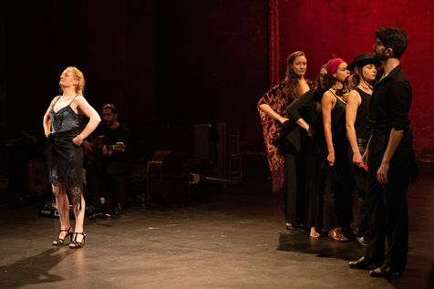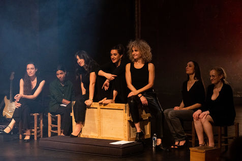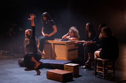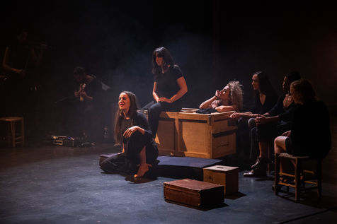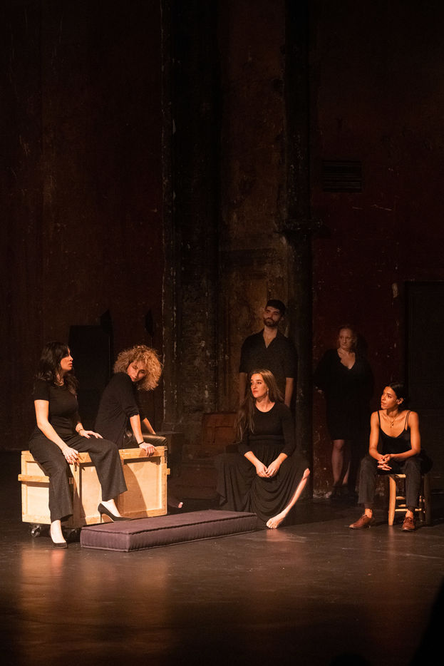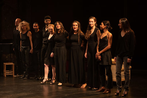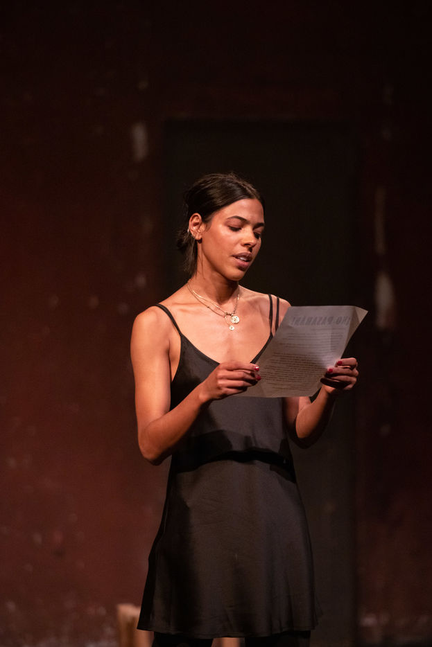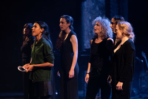 France, Paris, 2020-10-25. Andando, piece de theatre, mise en scene par Daniel San Pedro aux Bouffes du Nord. Avec Aymeline Alix, Audrey Bonnet, Zita Hanrot, Camélia Jordana, Estelle Meyer, Johanna Nizard, Liv Heym, Pascal Sangla et M hamed el Menjra.