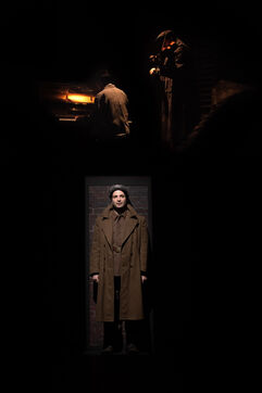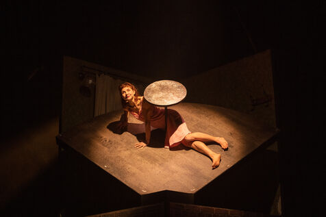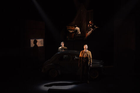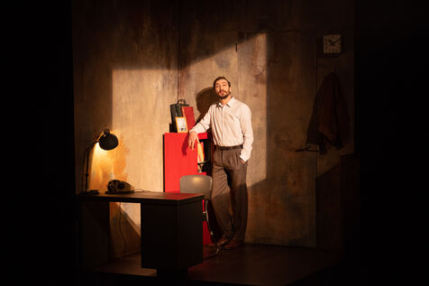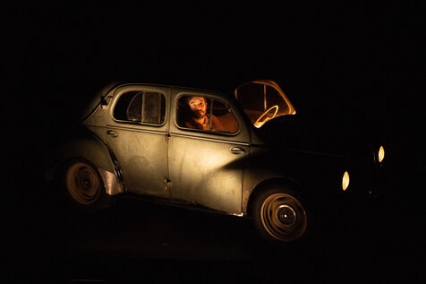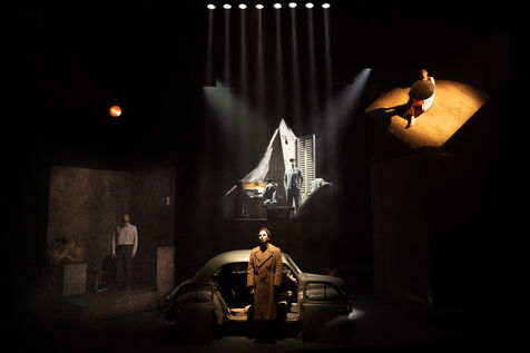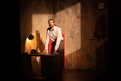 THEATRE - L'ESPE?CE HUMAINE OU L'INIMAGINABLE, based on La Douleur by Marguerite Duras, Autour d'un effort de me?moire by Dionys Mascolo and L'Enfer de Treblinka by Vassili Grossman, directed and set design by Mathieu Coblentz at the TNP theatre national populaire de Villeurbanne-Lyon at the Petit the?a?tre, salle Jean-Bouise, in January 2023 with Mathieu Alexandre, Florent Chapellie?re, Vianney Ledieu, Camille Voitellier and Jo Zeugma.