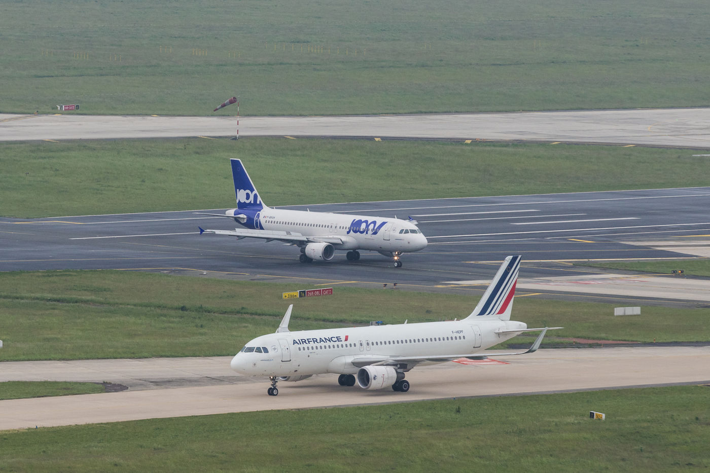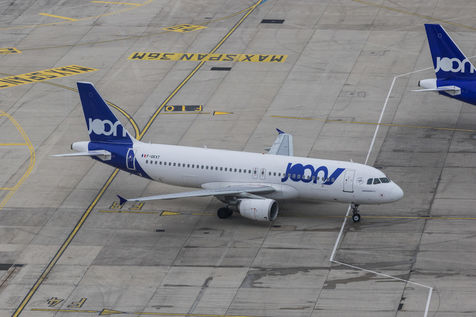 Des avions de la nouvelle compagnie JOON, filiale d'Air France, à l'aéroport Charles De Gaulle, à Roissy, près de Paris, en France, au mois de mai 2018.
