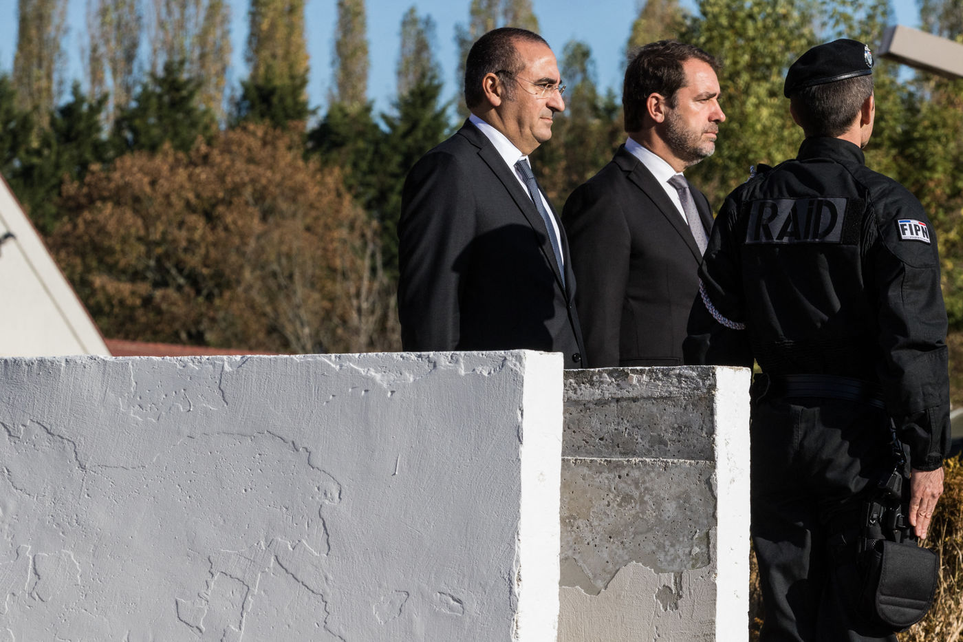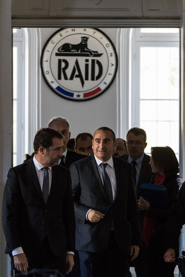Le ministre de l'Intérieur français, Christophe Castaner et le secrétaire d'État auprès du ministre de l'Intérieur, Laurent Nunez, ont rendu visite au RAID (Recherche Assitance Intervention Dissuasion) unité d'élite de la Police française, à Bièvres, près de Paris, France, le 27 Octobre 2018.