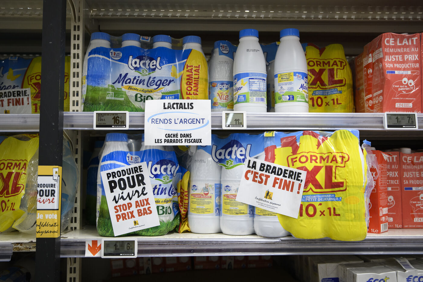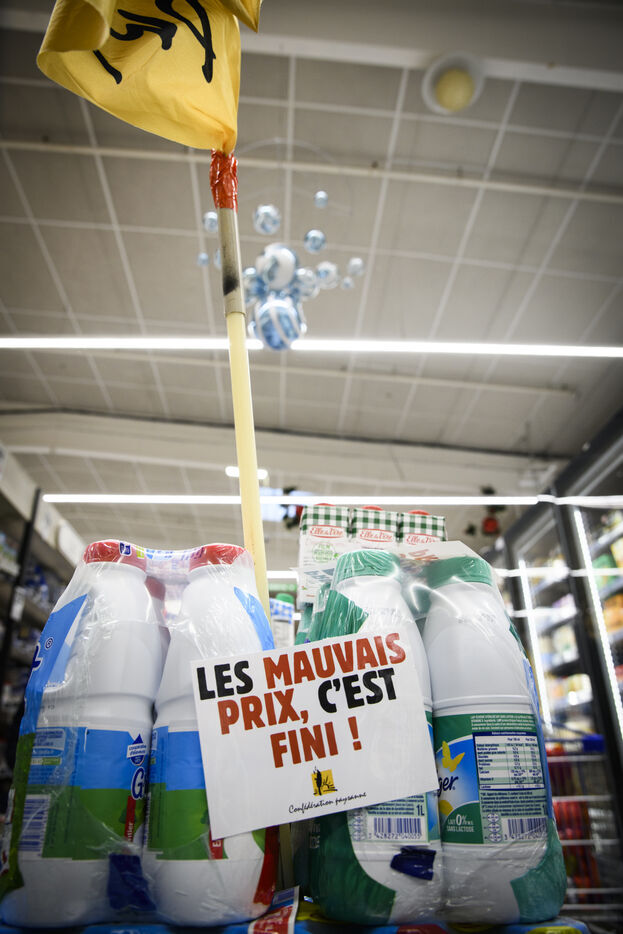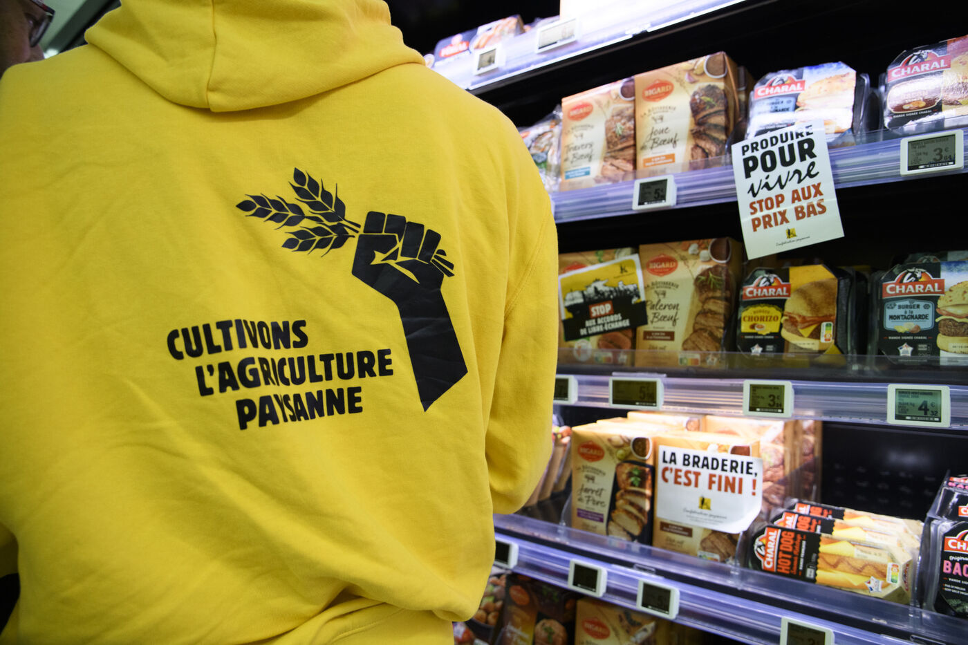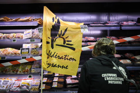 The Confédération Paysanne union went to a supermarket to put up protest stickers. The union opposes free trade agreements between South American countries and the European Union, MERCOSUR. They demand more dignified incomes, they demand peasant agriculture that respects nature.
