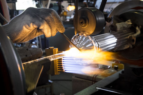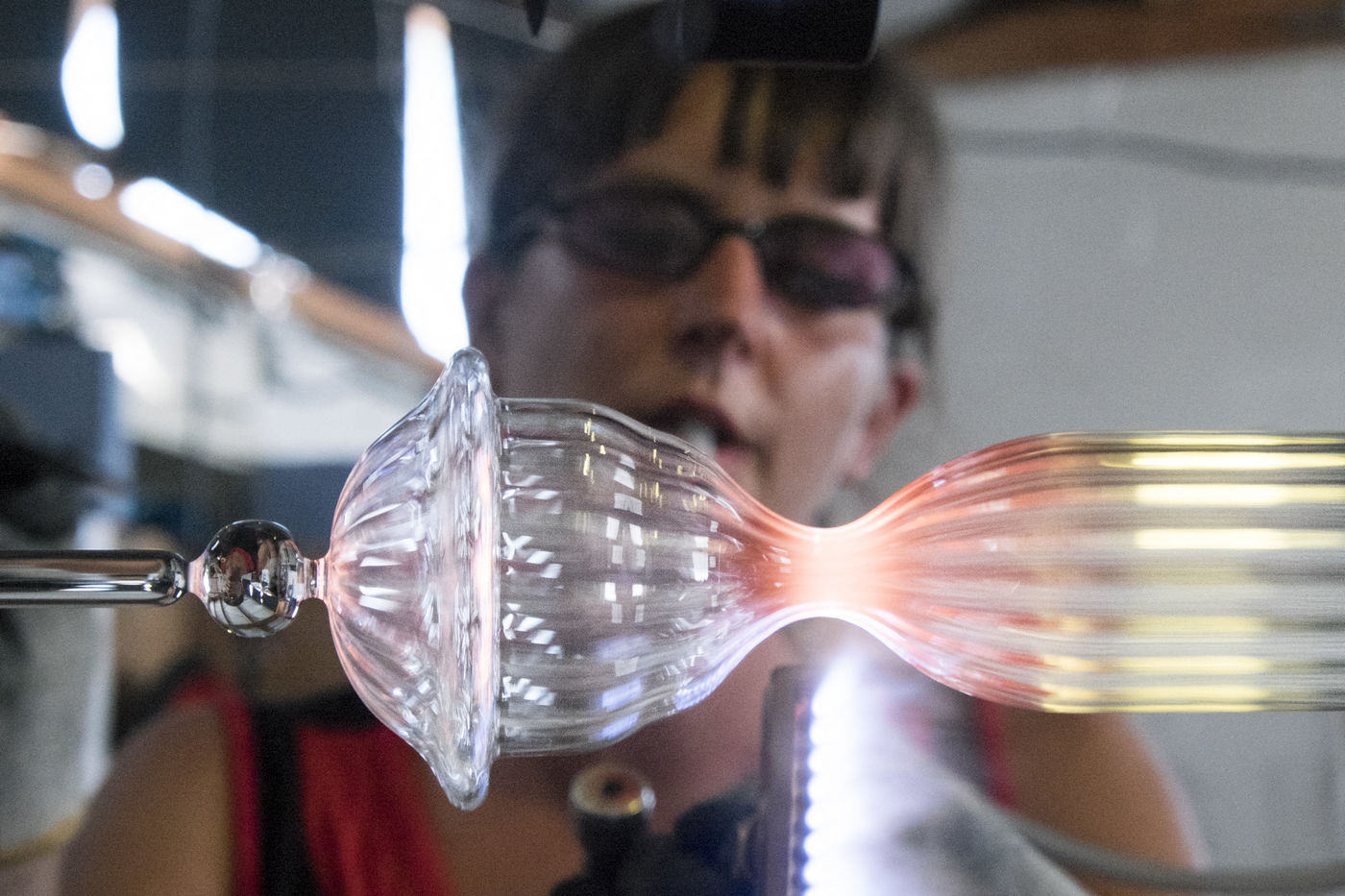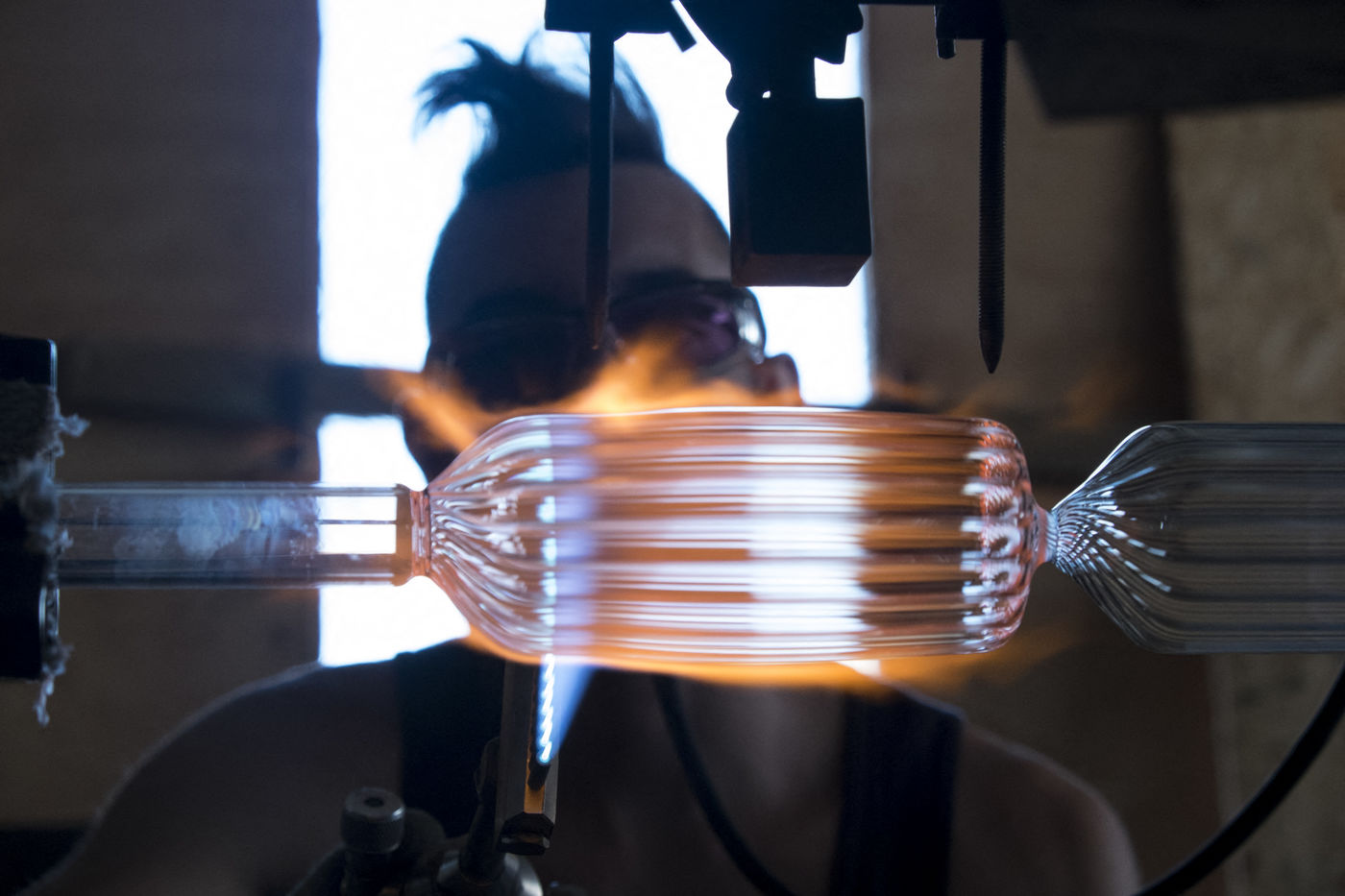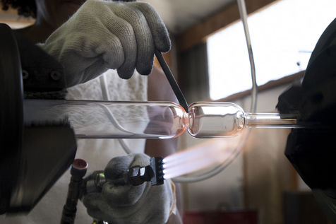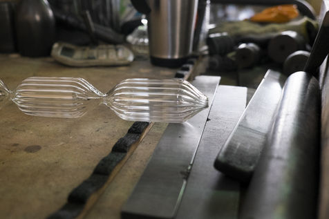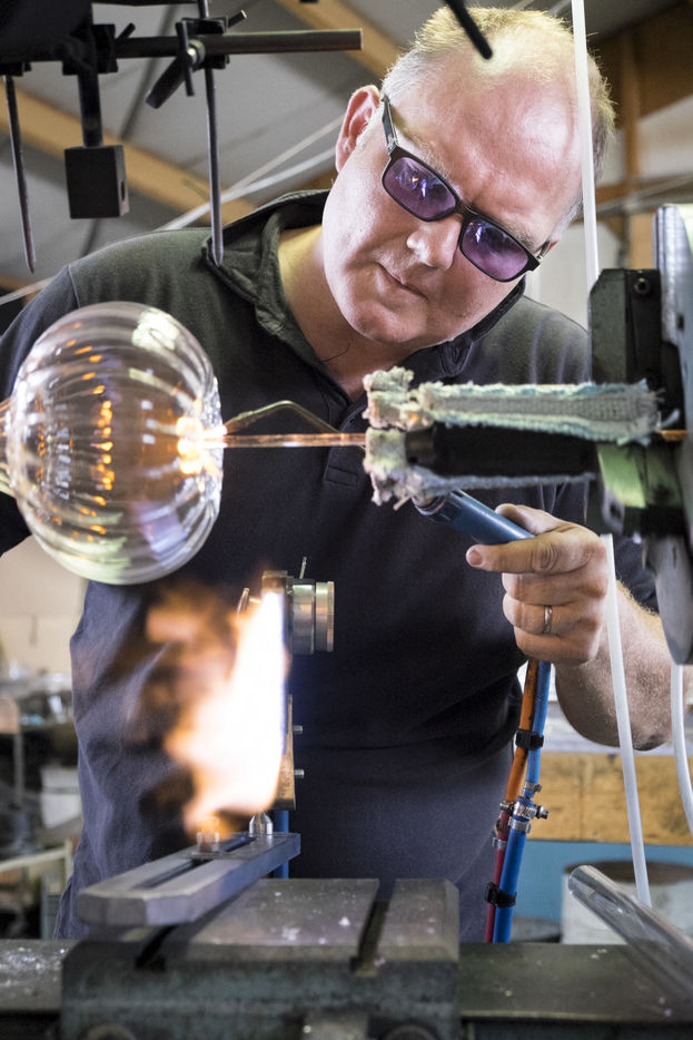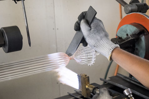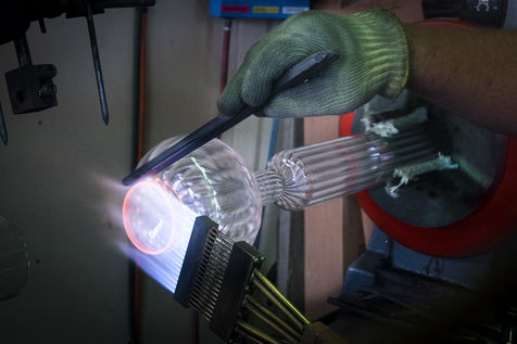 Toutes les pièces creuses sont soufflées à la bouche, lors du travail sur le tour de verrier, le petit tuyau blanc que le souffleur prend dans sa bouche, lui permet de souffler par l'intérieur de la canne de verre qui est creuse.