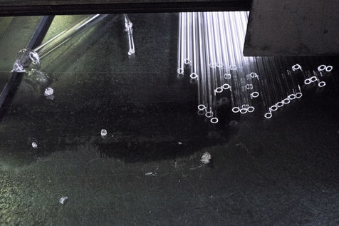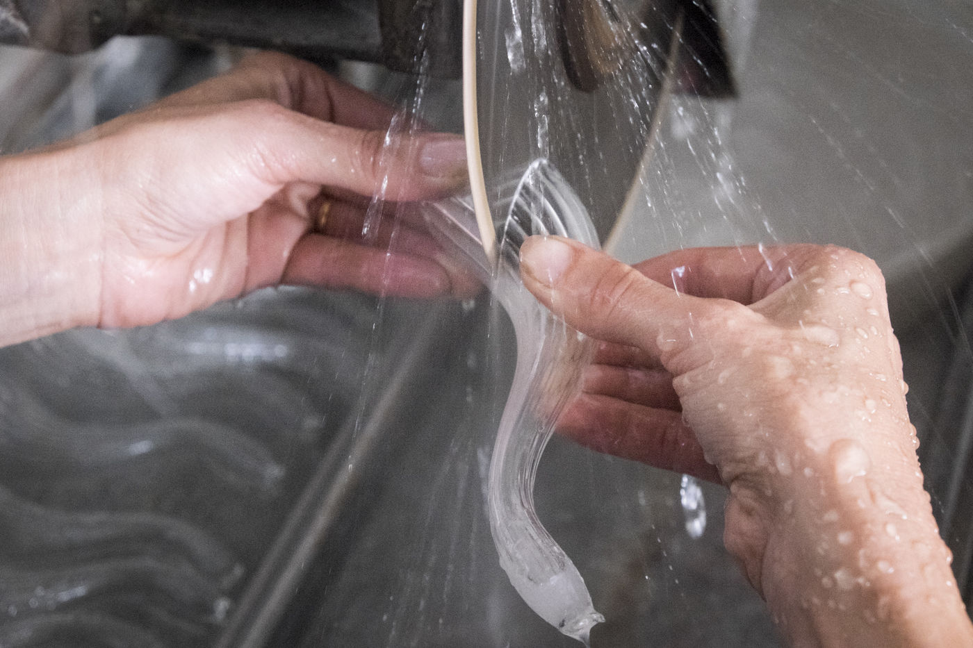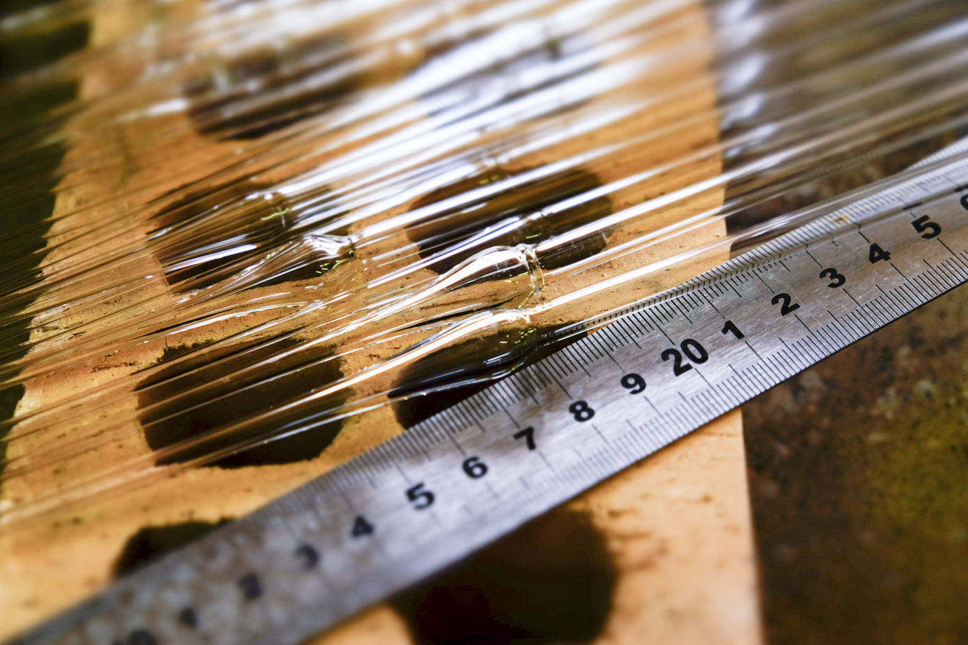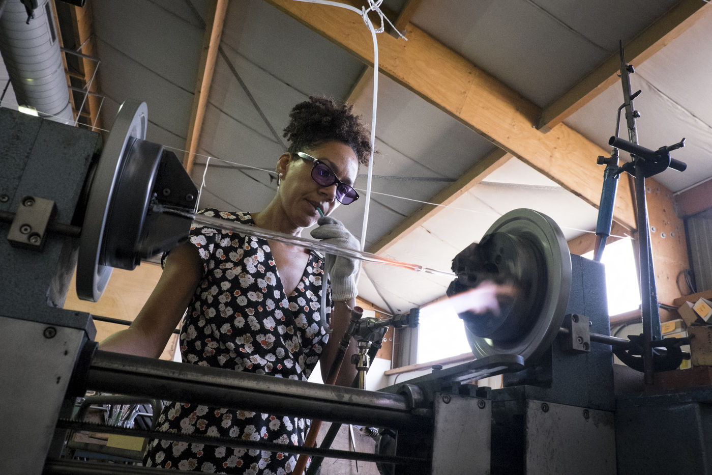 Toutes les pièces creuses sont soufflées à la bouche, lors du travail sur le tour de verrier, le petit tuyau blanc que le souffleur prend dans sa bouche, lui permet de souffler par l'intérieur de la canne de verre qui est creuse.