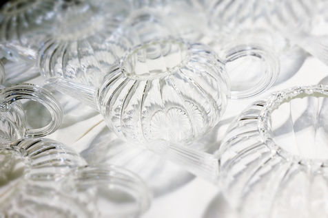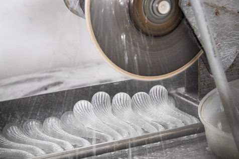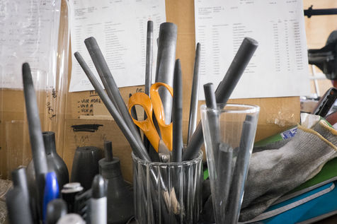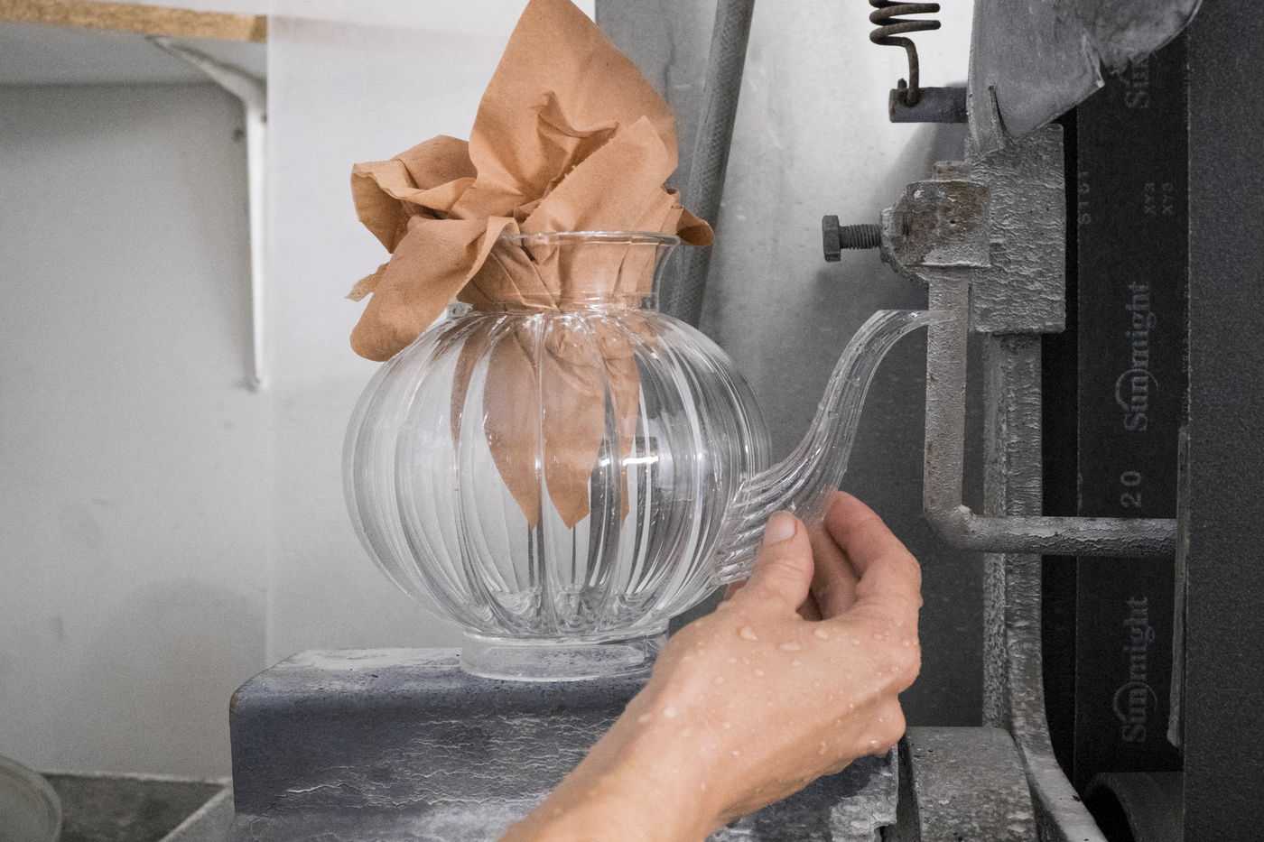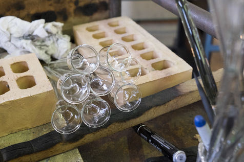 Les petites pièces qui ne sont pas fabriquées, à l'aide du tour (ex : bec de théière), sont soufflées directement à la bouche.