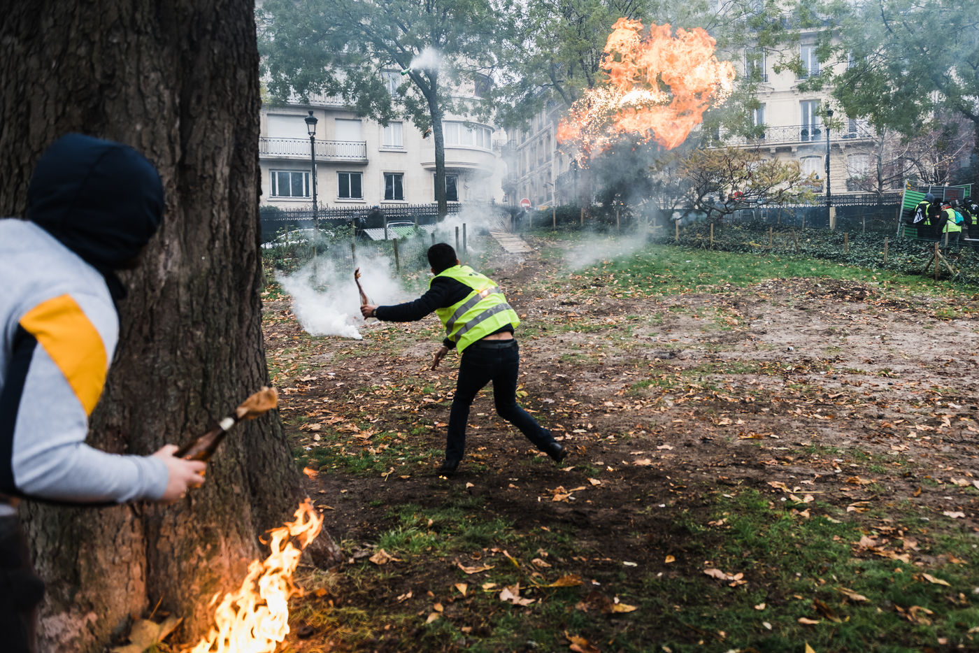 Thousands of Yellow vests protesters (Gilets Jaunes) were today on Champs Elysees avenue for the second time. The confrontation between demonstrators and the police force was very violent at Charles de Gaulle Etoile. Paris, December 1, 2018.