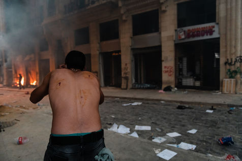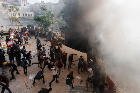 Après l'explosion meurtrière du 4 août qui a dévasté la capitale, des milliers de manifestants se sont rassemblés place des Martyrs pour crier leur révolte et demander la démission du gouvernement. De violents affrontements ont eu lieu entre les manifestants et la police anti émeute. Beyrouth, samedi 8 aout 2020.