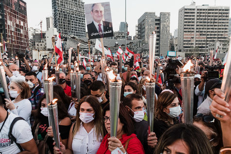 Des milliers de libanais ont manifeste dans les rues de Beyrouth pour marquer le premier anniversaire du mouvement de protestation anti-corruption. La marche est partie de la place des Martyrs pour se rendre dans le quartier de Hamra. En fin de journee, les manifestants se sont reunis au port ou des sculptures ont ete installees en hommage aux victimes de la double explosion du 4 aout. Beyrouth, 17 octobre 2020
