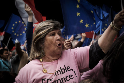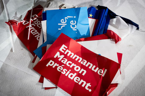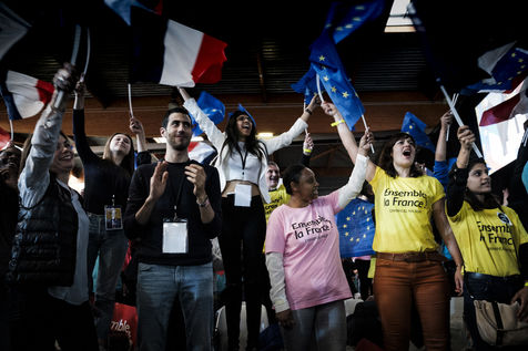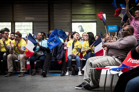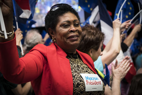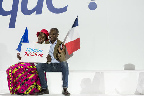 Paris, France le 1er Mai 2017 - Le candidat à l'élection présidentielle, Emmanuel Macron, lors de son meeting d'entre deux tours au Paris Event Center à La Villette.