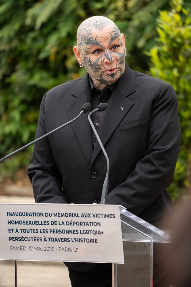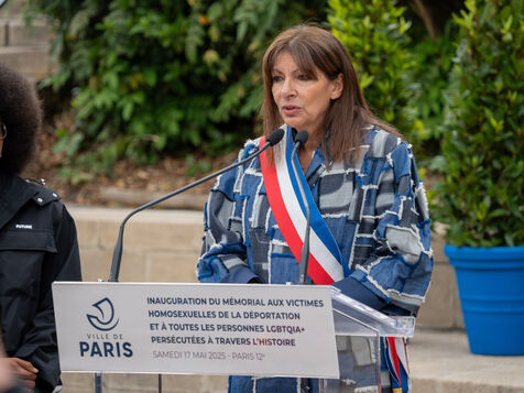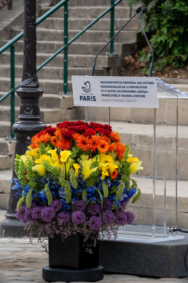Inauguration of the “Memorial to the Forgotten” by artist Jean-Luc Verna at the Port de l'Arsenal gardens in Bastille, with the Socialist mayor of Paris, Anne Hidalgo, and the deputy mayor of Paris in charge of combating discrimination, Jean-Luc Romero, in tribute to homosexual victims of deportation on the occasion of the International Day Against LGBTQIA+phobias.