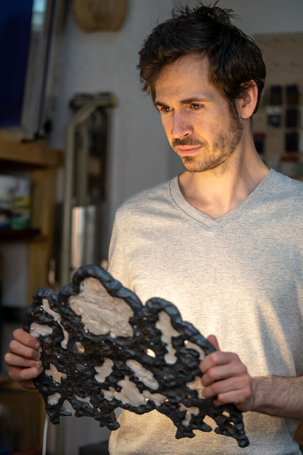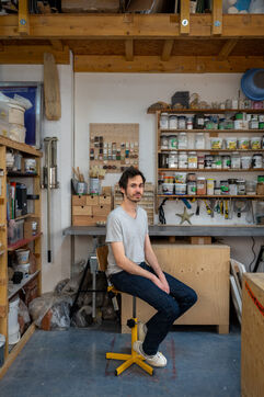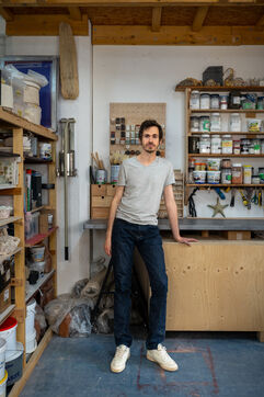 Portrait de l’artiste Xavier Orssaud dans son atelier