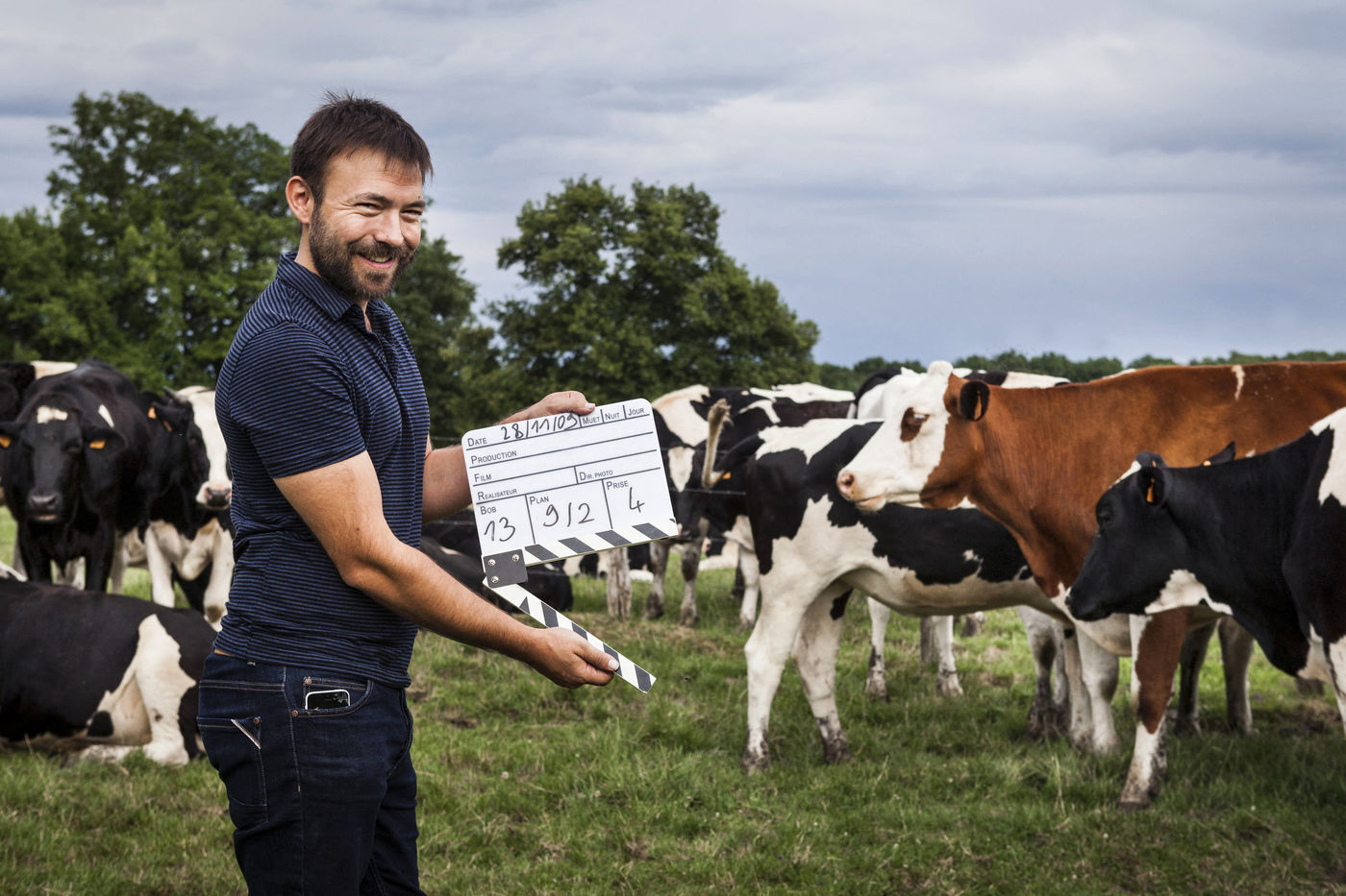 Hubert Charuel, réalisateur, sur la ferme de ses parents en Haute-Marne, où son premier long-métrage de fiction, Petit Paysan (août 2017), a été tourné. Droyes, France - 13 juillet 2017