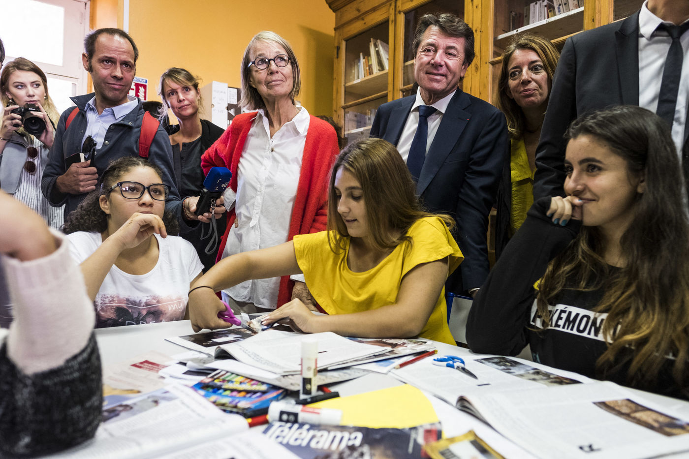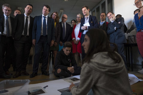 Movement of Françoise Nyssen, Minister of Culture, accompanied by the Mayor of Nice Christian Estrosi, in the former Mistral College in Arles. Discovery of three practical workshops on how to read the image.