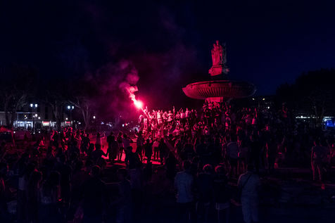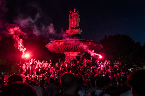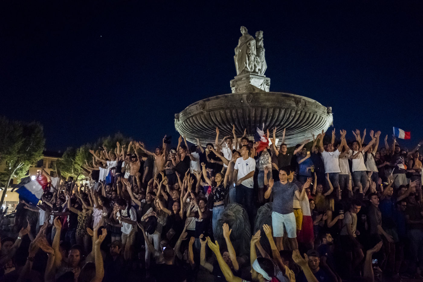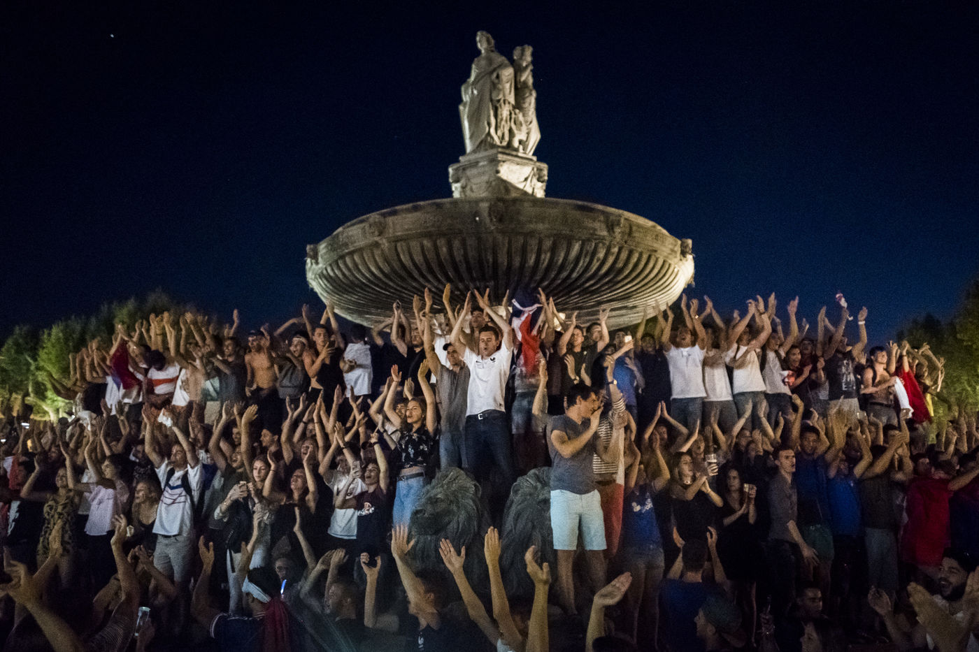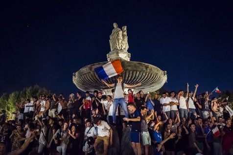 10 Juillet 2018, Manifestation de joie des supporters français après la victoire de l'équipe de France de Football face à l'équipe de Belgique 1 but a 0 en demi finale. Ici la fontaine de la rotonde à Aix en provence envahi par des supporters sur le boulevard du court Mirabeau.