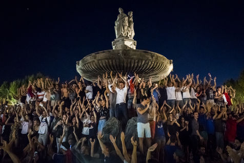 July 10, 2018, Demonstration of joy of the French fans after the victory of the French Football team against the Belgian team 1 goal to 0 in the semifinals. Here the fountain of the Rotonde in Aix en Provence invaded by supporters on the court Mirabeau.