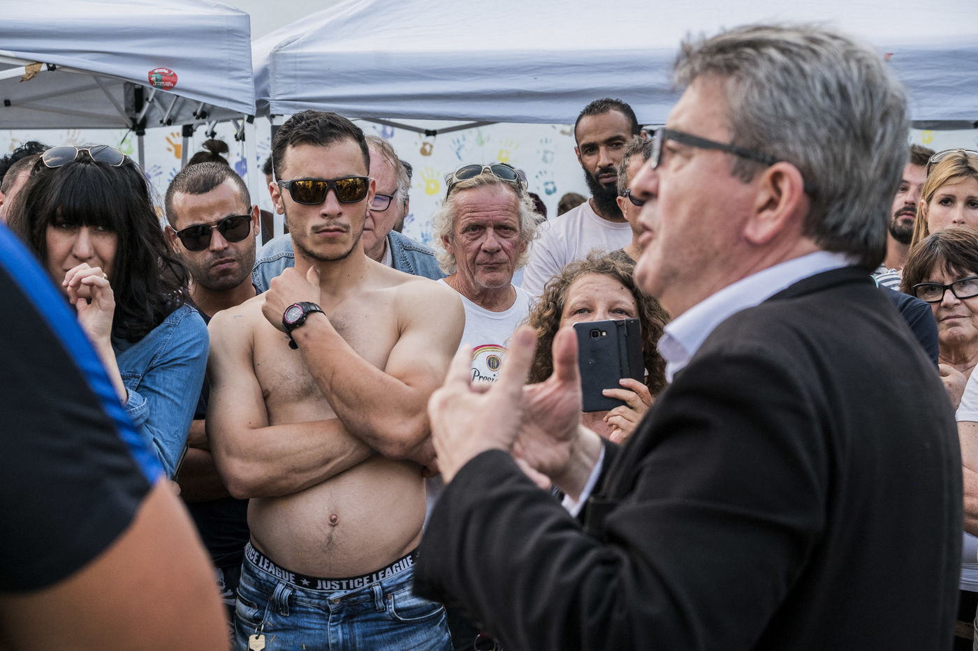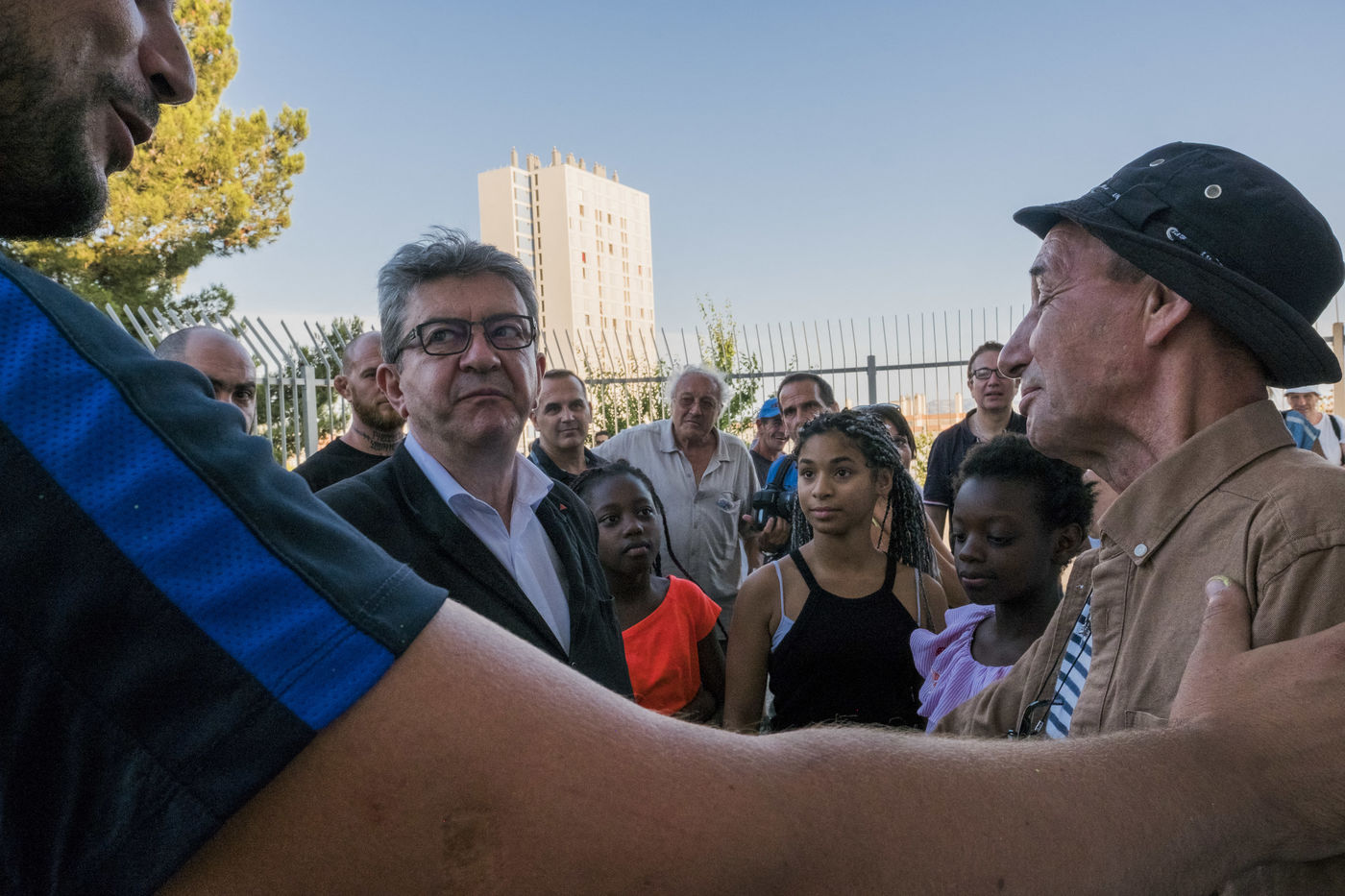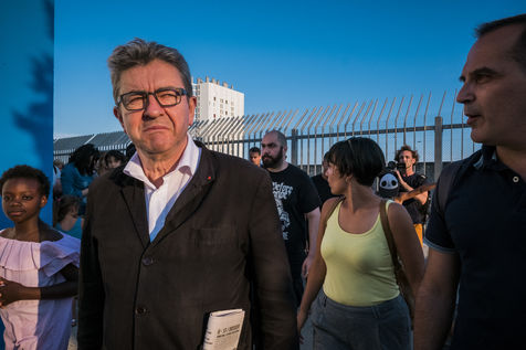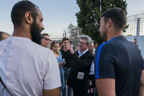Jean-Luc Mélenchon, député France Insoumise, est venu voir les bénévoles de La France Insoumise et les parents d?élevées qui ont participer a un chantier de rénovation des espaces extérieurs du groupe scolaire de La Viste-Bousquet à Marseille, le 21 Juillet 2018.