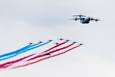 Aerial demonstration by the Patrouille de France accompanied by a Airbus A400M. BA 701 in Salon de Provence hosted a large-scale aeronautical event. Held to mark the 70th anniversary of the Patrouille de France, the National Air Show was organized to benefit the Fondation des Œuvres Sociales de l'Air. May 20 and 21, 2023. France
