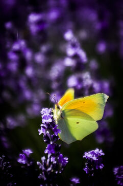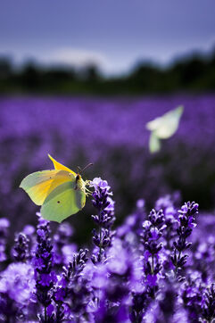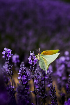 Lemon butterflies in the lavender fields on the Provençal plateau of Valensole, in the Alpes-de-Haute-Provence. France