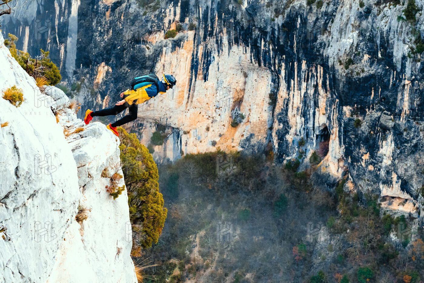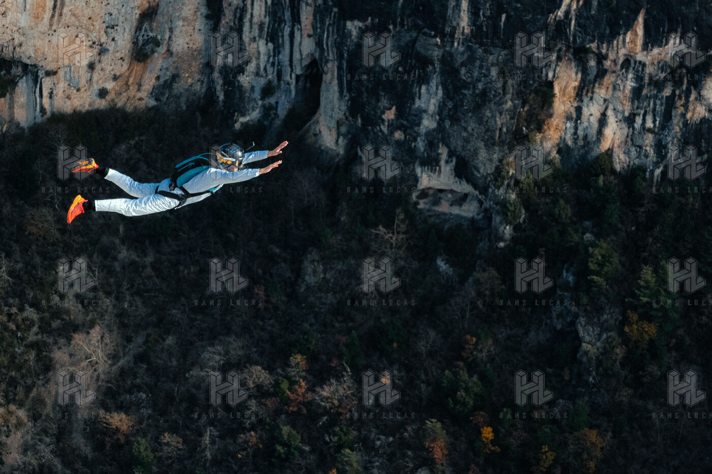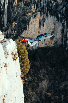 France, Moustier Sainte Marie, 9 december 2023, base jumping is a thrilling sporting activity consisting of jumping from a high point and then opening your parachute. Photograph by Louai Barakat / Hans Lucas.
