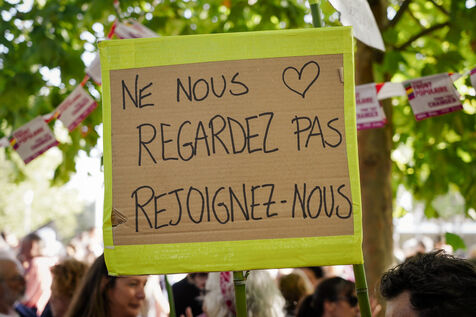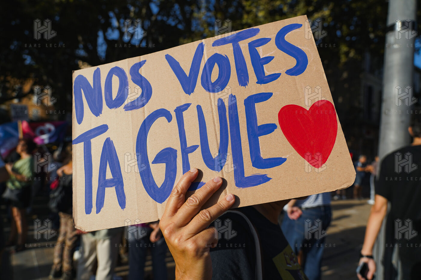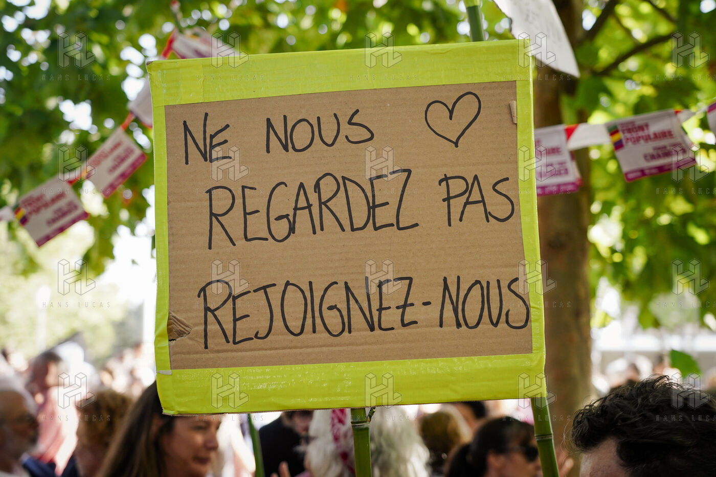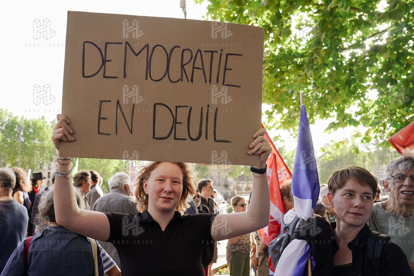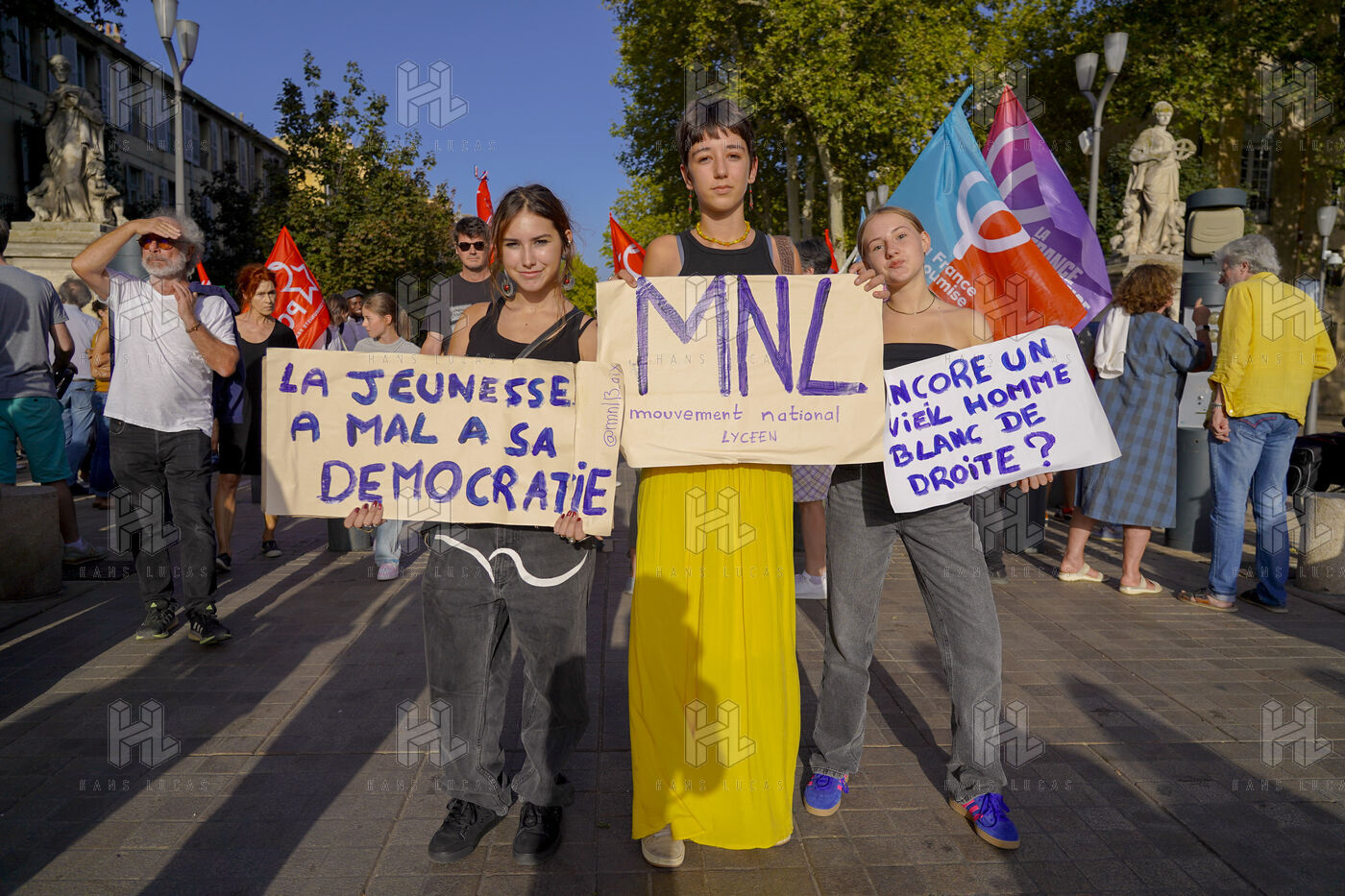 Des gens participent à une manifestation contre la nomination du Premier ministre de droite Michel Barnier par le président français Emmanuel Macron à Aix-en-Provence, dans le sud de la France, le 7 septembre 2024. Des manifestations à l'échelle nationale ont lieu le 7 septembre, menées par les dirigeants politiques de la coalition de partis de gauche française, ainsi que par les syndicats, pour dénoncer le président français pour ne pas avoir nommé un Premier ministre de gauche après avoir pris le risque de dissoudre le Parlement en juin et d'avoir convoqué des élections anticipées en juillet au cours desquelles son alliance centriste a perdu sa majorité relative au Parlement. LOUAI BARAKAT / HANS LUCAS