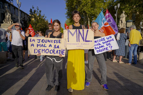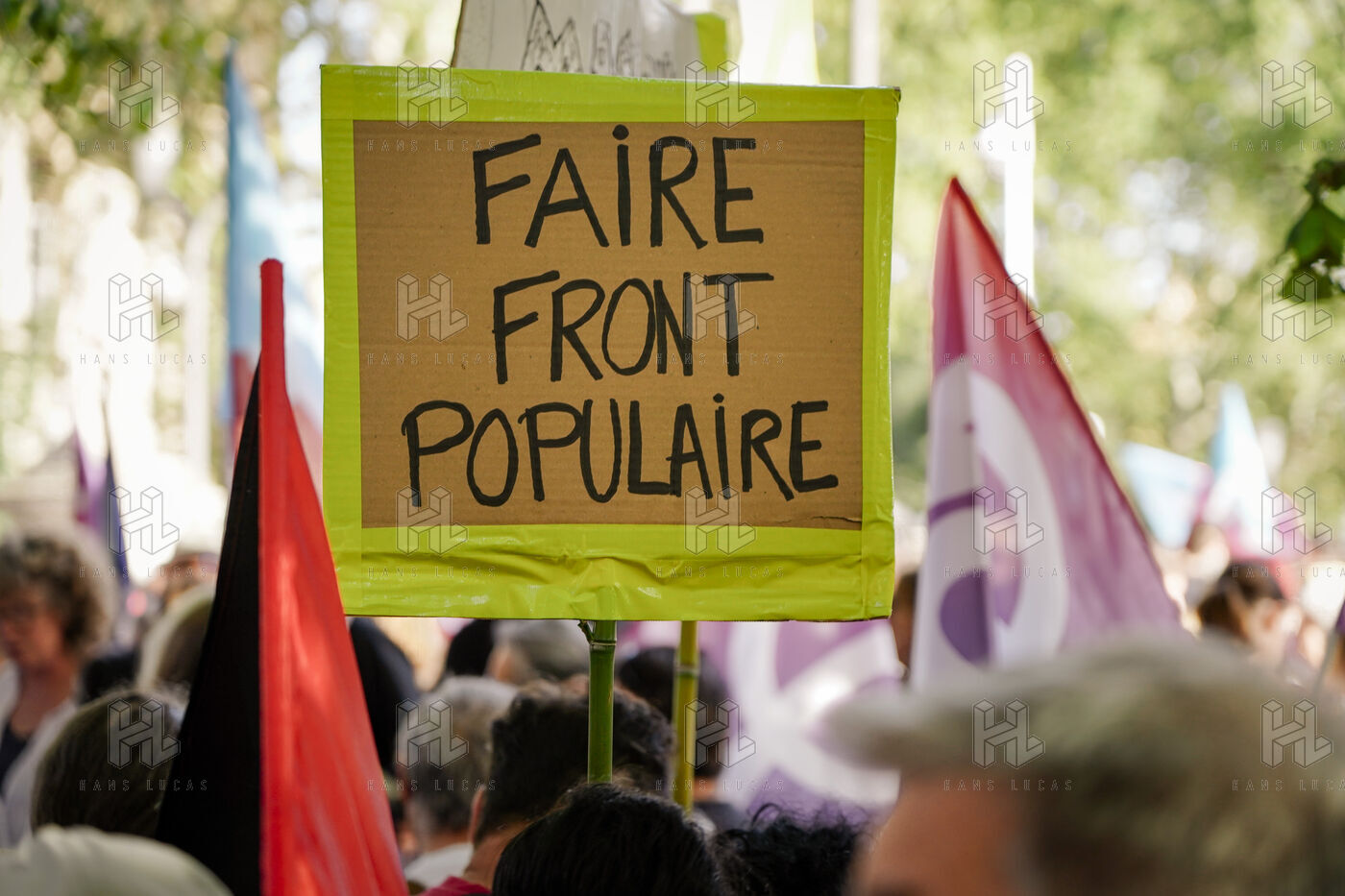People take part in a demonstration against the appointment of right-wing Prime Minister Michel Barnier by French President Emmanuel Macron in Aix-en-Provence, southern France, on September 7, 2024. Nationwide protests are taking place on September 7, led by political leaders from France's coalition of left-wing parties, as well as trade unions, to denounce the French president for failing to appoint a left-wing prime minister after risking dissolving parliament in June and calling early elections in July in which his centrist alliance lost its relative majority in parliament. LOUAI BARAKAT / HANS LUCAS