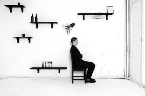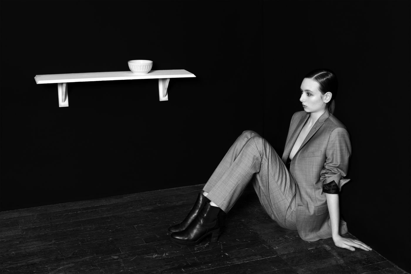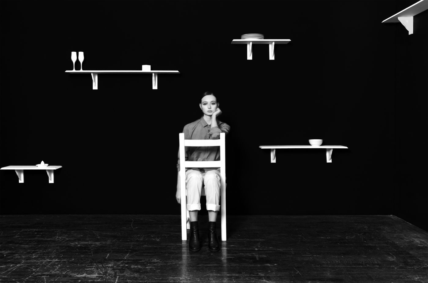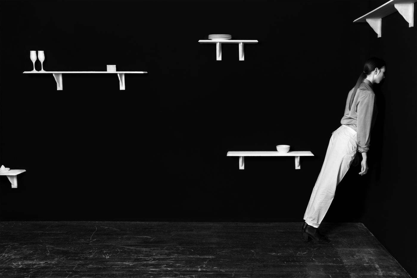 Espace sculptural, espace performé, les personnages semblent être dirigés par ce lieu dans une extrême lenteur. La pièce est à la fois un lieu de vie et un décor imaginaire, presque surréaliste. Chaque élément construit la scène, le vêtement devient alors matière première à la construction de cette