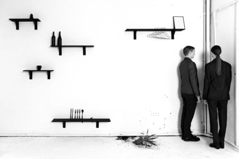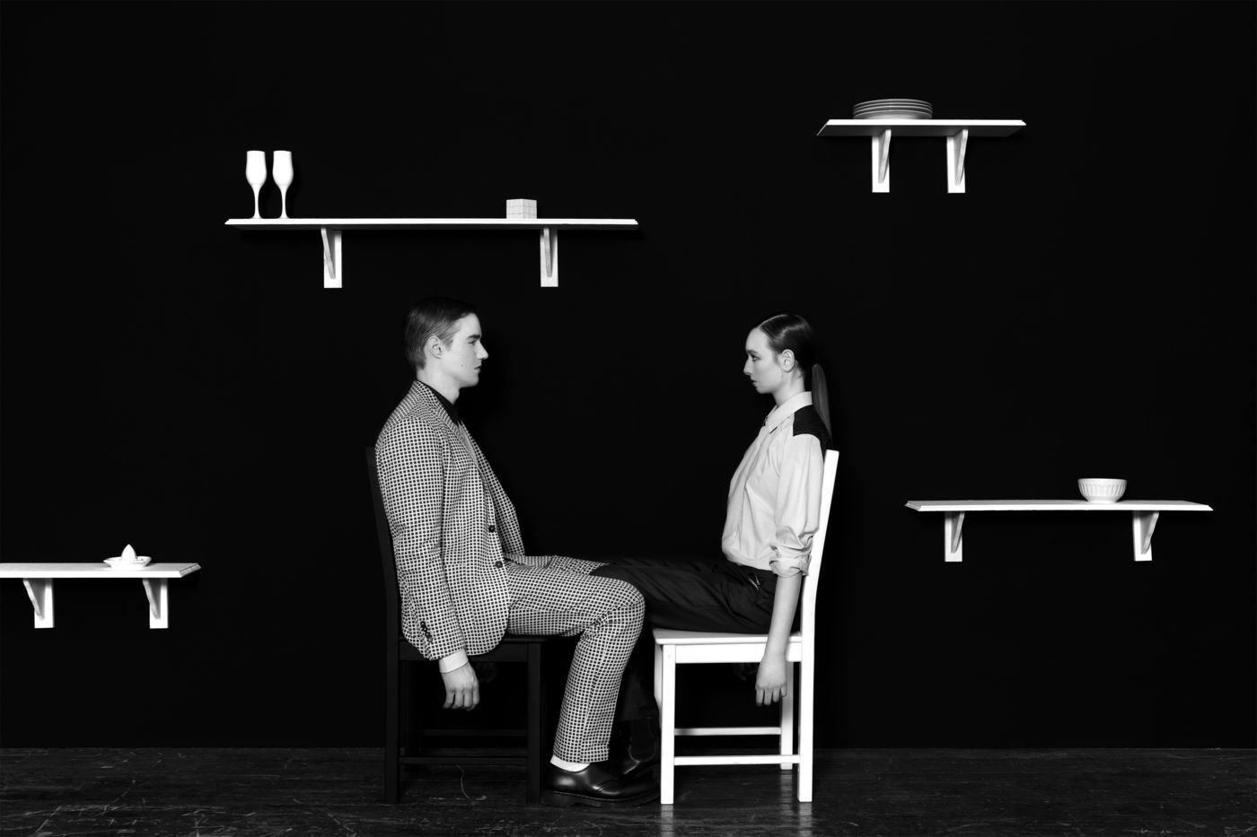 par les objets présents dans la pièce. Tout évolue en miroir, chaque image s'oppose à une seconde comme si les deux acteurs se renvoyaient l'un à l'autre sans cesse.