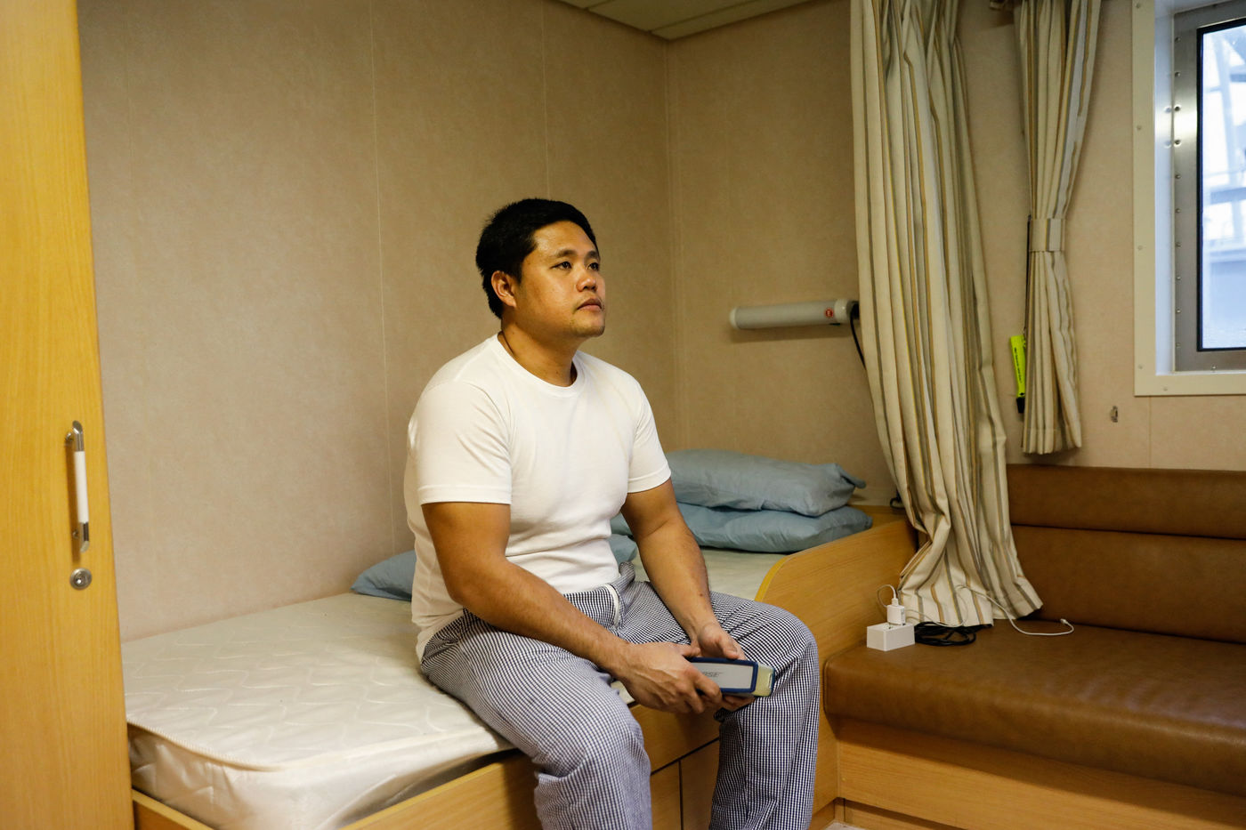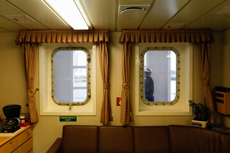 Darius ne quitte pas le port des yeux. Capitaine à bord, il est seul responsable sans avoir le contrôle de toutes les manoeuvres. Andrew attend, surveille, passe dans la cuisine où des crevettes cuisent pour le déjeuner.
