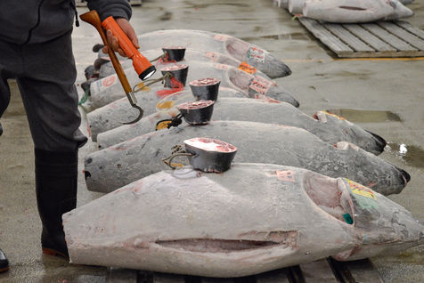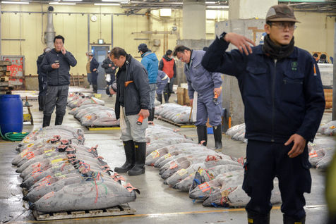 Japon, Tokyo, Tourisme, janvier 2017 - Reportage matinal à Tsukiji, le plus grand marché aux poissons au monde, à l'occasion d'une vente aux enchères de thon. Créé en 1935, le marché de Tuskiji ferme définitivement ses portes le 6 octobre pour rouvrir le 11 à Toyosu, dans un lieu moins pittoresque mais aux normes hygiéniques bien plus modernes.