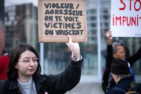 Activists and supporters gather in front of the court of justice in solidarity with the victims of Gérard Depardieu, as well as all victims of gender-based and sexual violence and harassment, during the actor's trial, where he is being judged for sexual assault by two women.