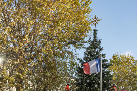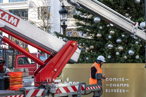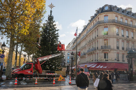 Cette année les illuminations de Noël 2024 sur l'avenue des Champs Elysées à Paris sont marquées par la célébration de la vasque du ballon du jardin des Tuileries. Elle avait séduit le public pendant les JO de Paris 2024. Des décorateurs ont préparé un immense sapin avant la cérémonie du coup d'envoi des illumination.