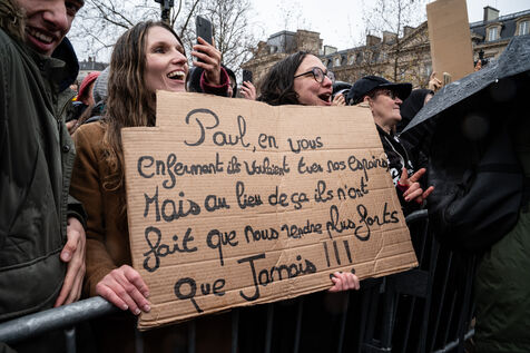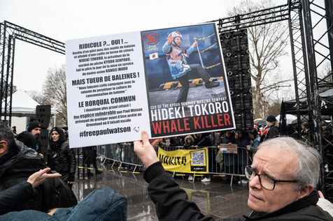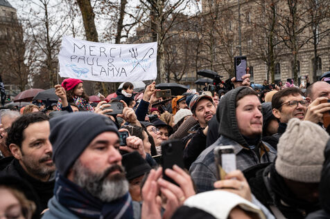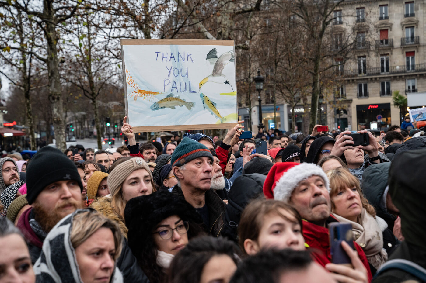 Paul Watson, founder of Sea Shepherd, symbolically celebrates his release with supporters at the Place de la République in Paris, France, on Saturday December 21, 2024. After five months in detention in Denmark, whale conservationist Paul Watson arrived in Paris, France, on Friday December 20, 2024, after his extradition to Japan was refused.